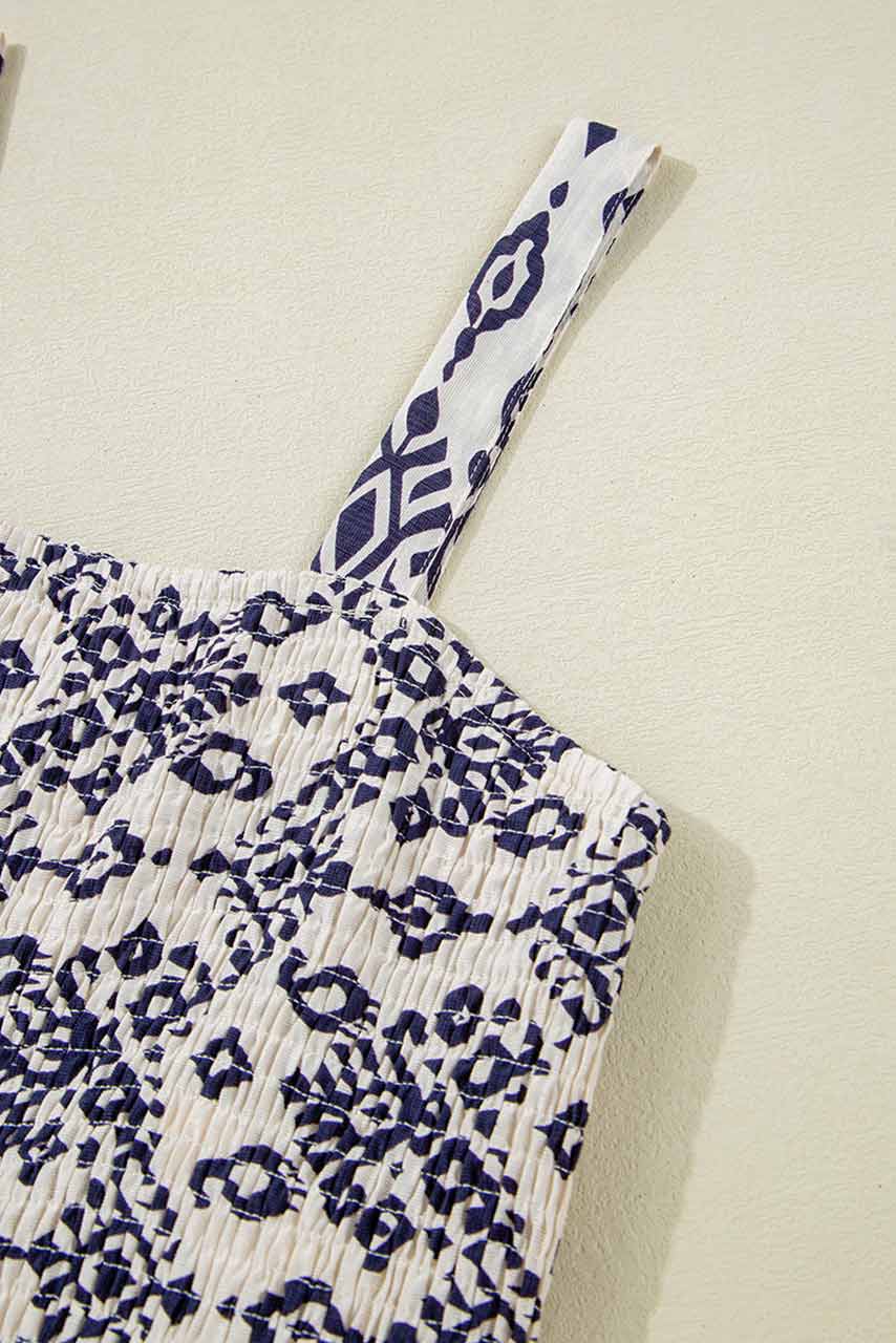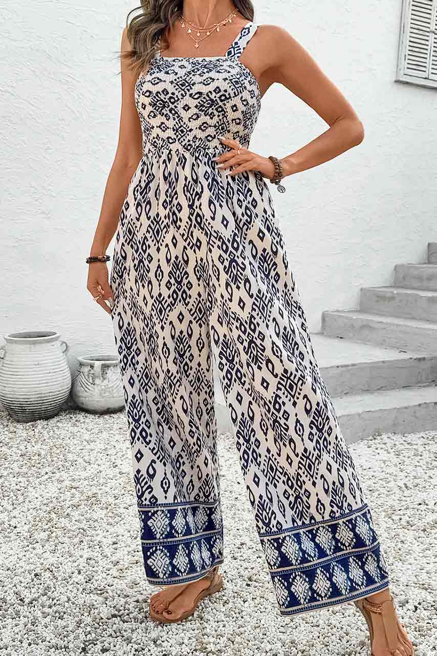 Boho vibes, καλοκαιρινή άνεση και στυλ που ξεχωρίζει! Αυτή η ολόσωμη φόρμα με ethnic print σε μπλε και εκρού αποχρώσεις είναι το κομμάτι που θα ανανεώσει τη γκαρνταρόμπα σου. Διαθέτει smok ελαστικό μπούστο που εφαρμόζει άψογα, φαρδιές τιράντες για άνεση και φαρδύ, ριχτό παντελόνι που χαρίζει ανάλαφρη κίνηση. Ιδανική για καλοκαιρινές αποδράσεις, νησιώτικες εξορμήσεις και πρωινές βόλτες στην πόλη. Το μοτίβο της παραπέμπει σε bohemian αισθητική, ενώ οι πρακτικές τσέπες προσθέτουν bonus πόντους στο καθημερινό σου outfit.