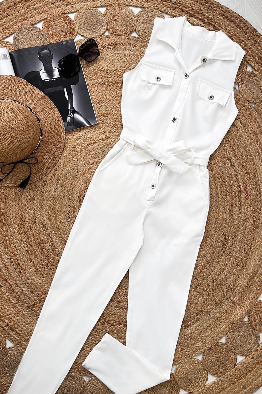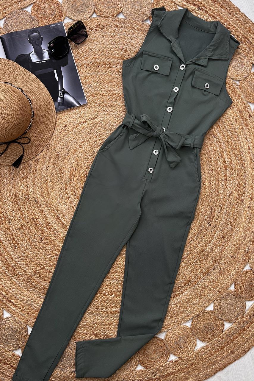 Boiler style ολόσωμη μονόχρωμη αμάνικη φόρμα με κουμπιά κατά μήκος, ζώνη ίδιου υφάσματος και τσέπες.