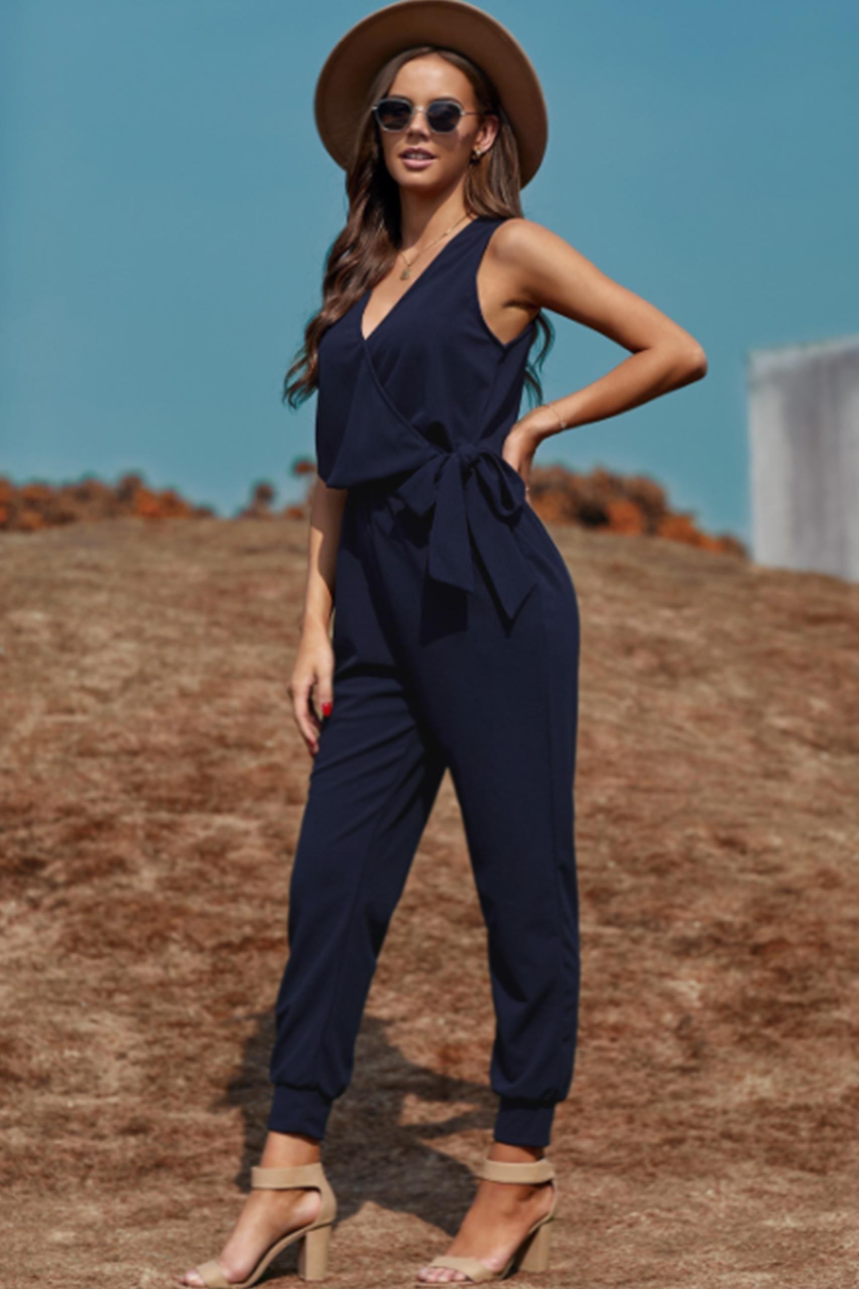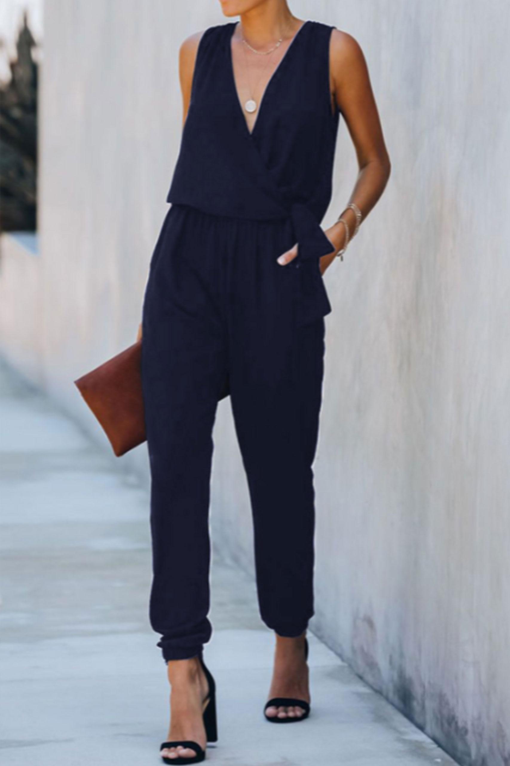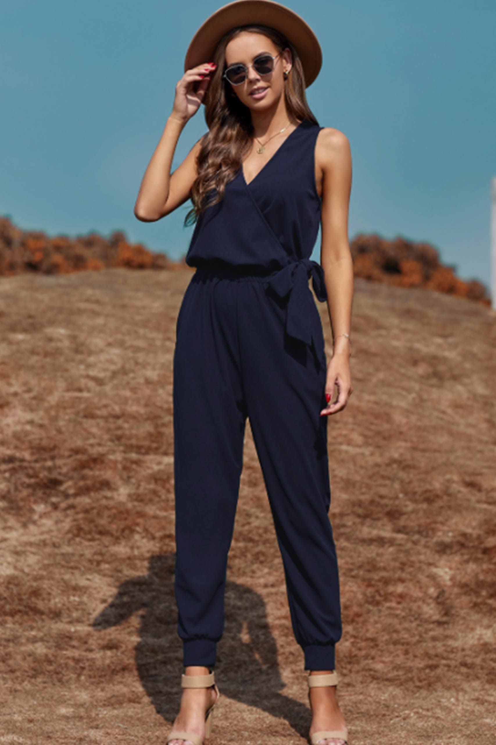 Overall ολόσωμη φόρμα V neck με δέσιμο στη μέση σε σκούρες αποχρώσεις.