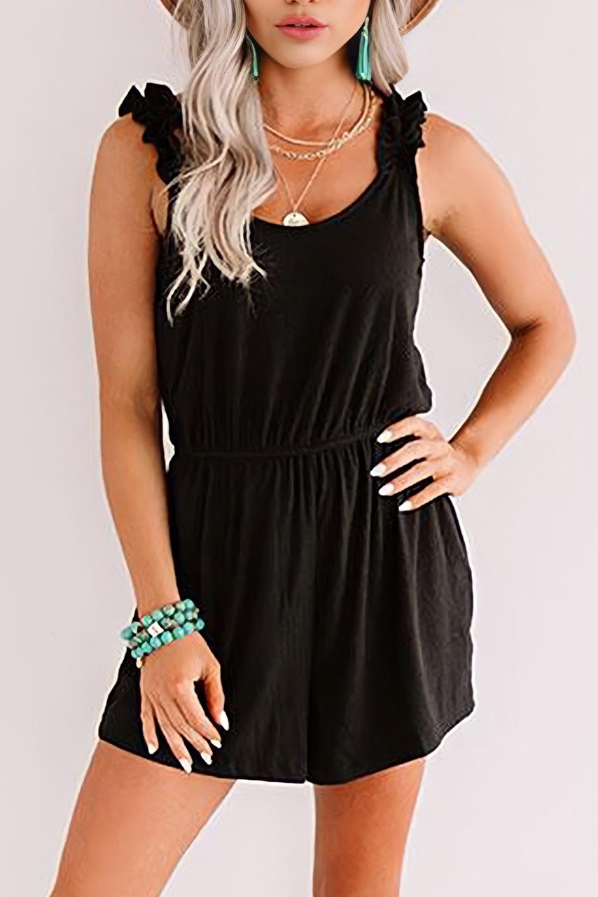 Romantic casual playsuit ολόσωμη μίνι φόρμα σε μαύρο χρώμα με βολάν στις τιράντες και λεπτό κορδόνι αυξομείωσης στη μέση.