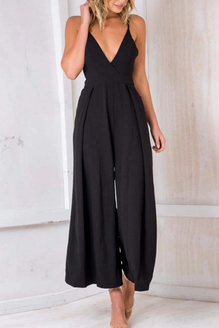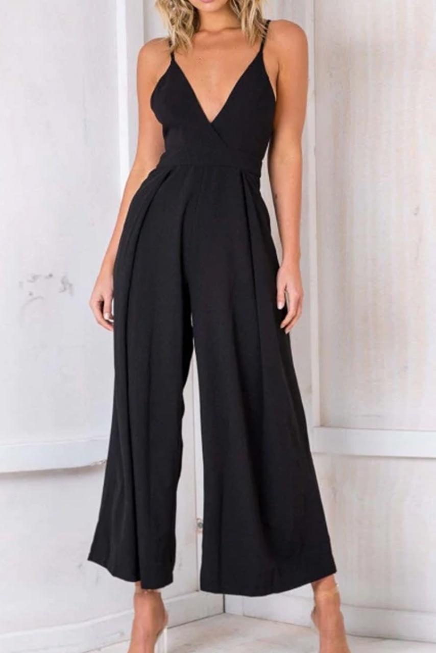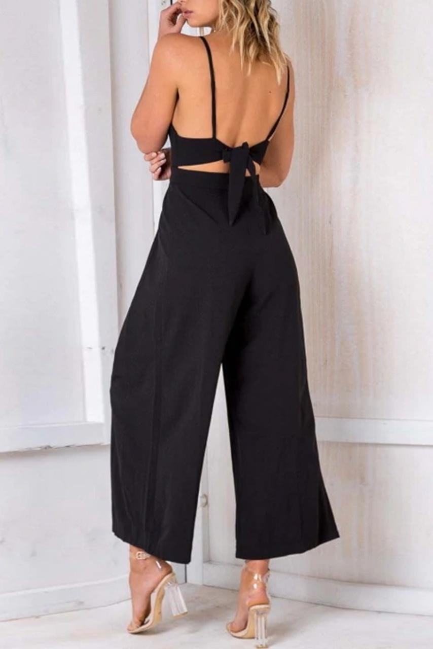 Retro cut V neck jumpsuit με natural back tie σε μαύρο χρώμα με balconette κόψιμο on top και άνοιγμα καμπάνα στο τελείωμα.