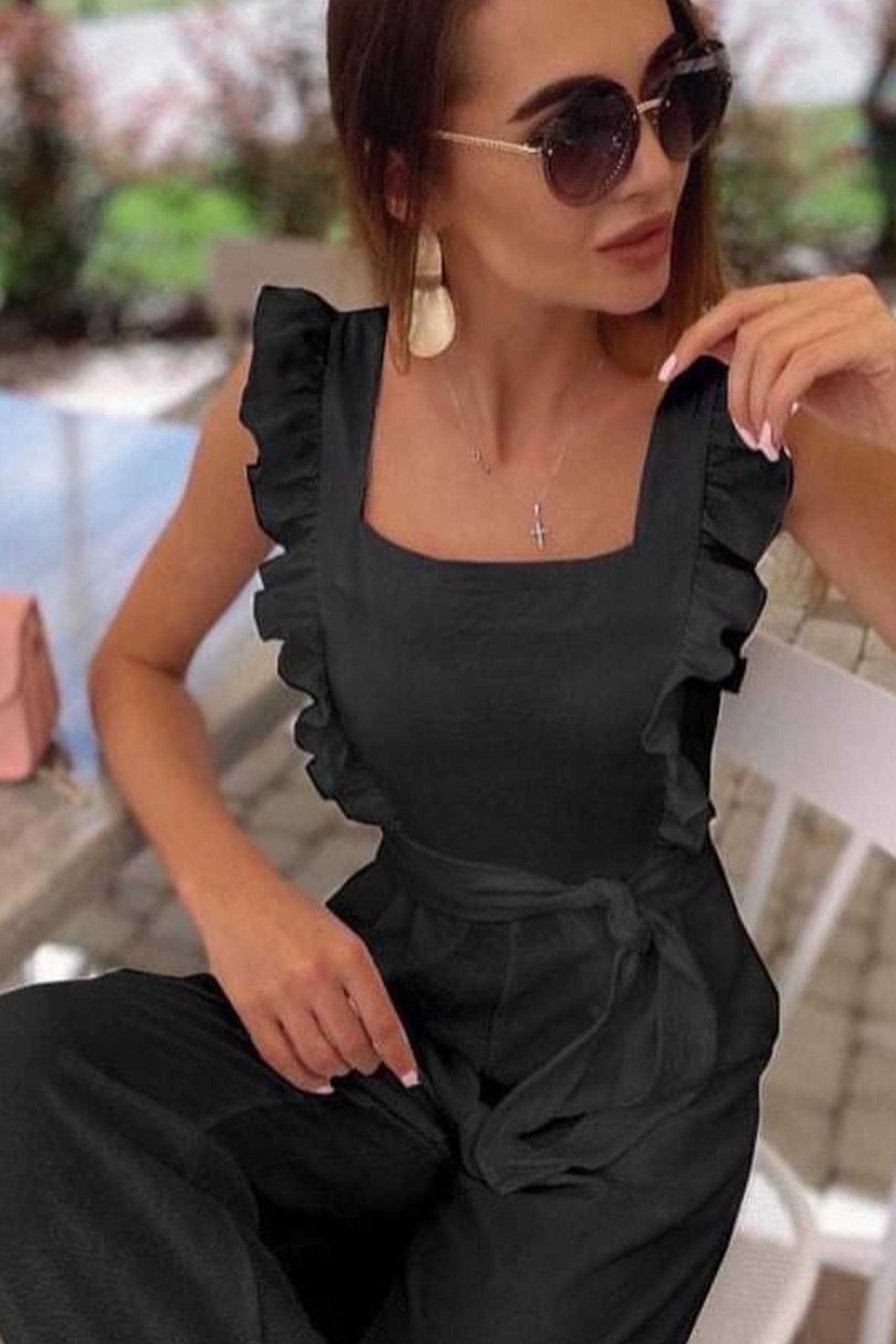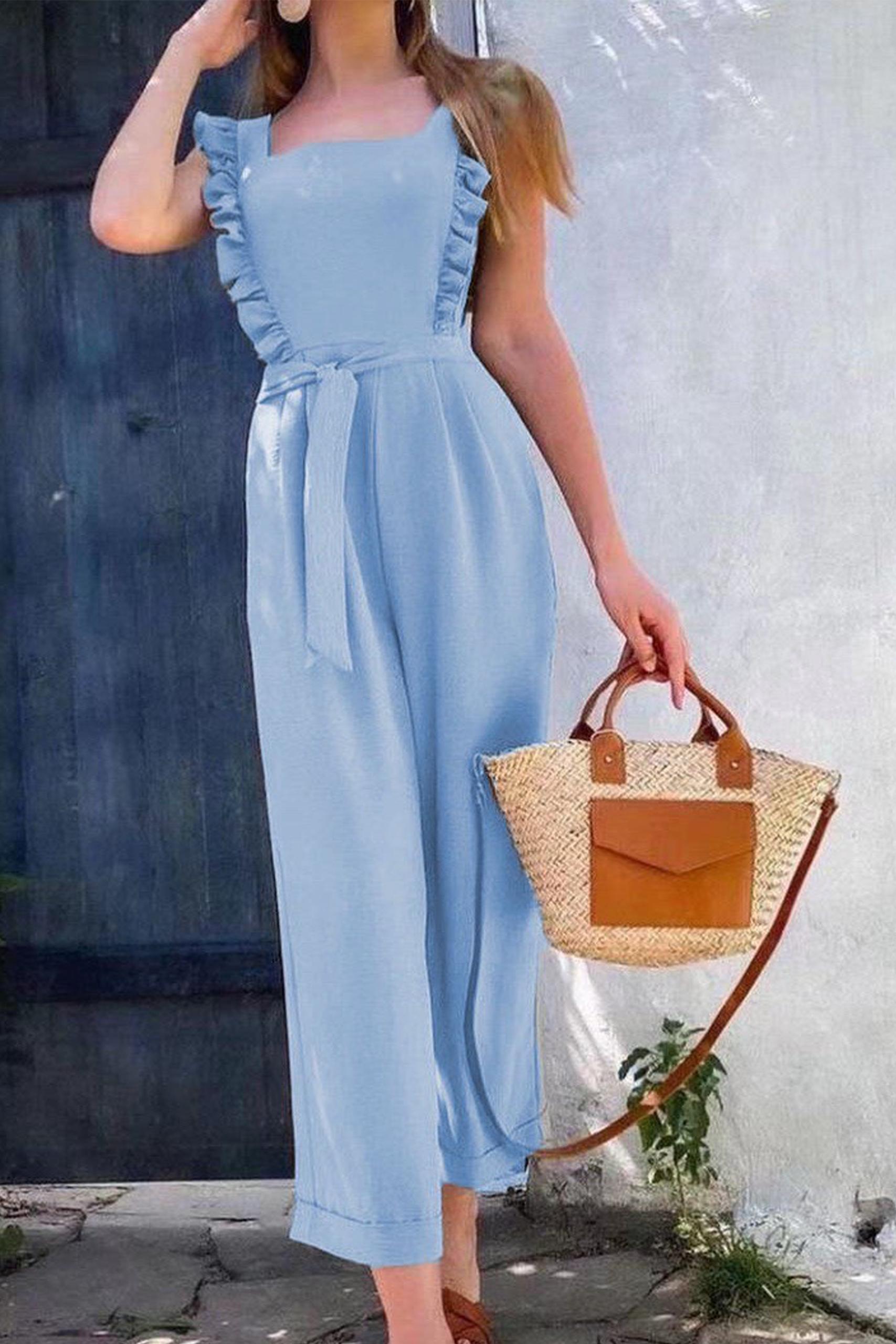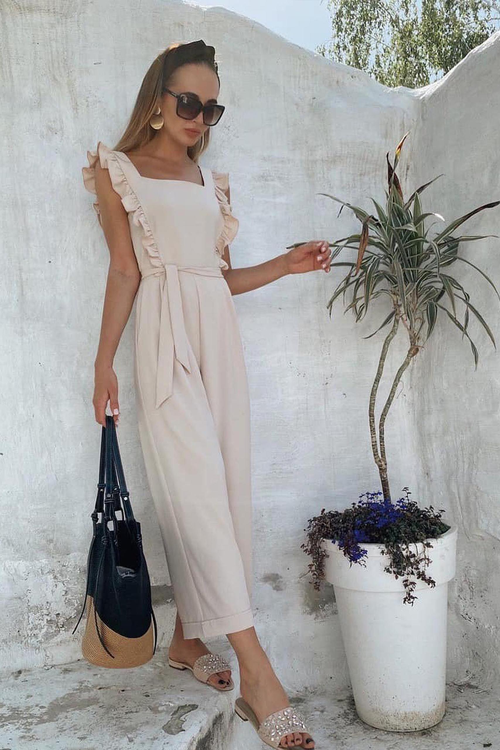 Romantic jumpsuit σε τρεις αποχρώσεις με βολάν στο μανίκι και ζωνάκι στο ίδιο ντεσέν.