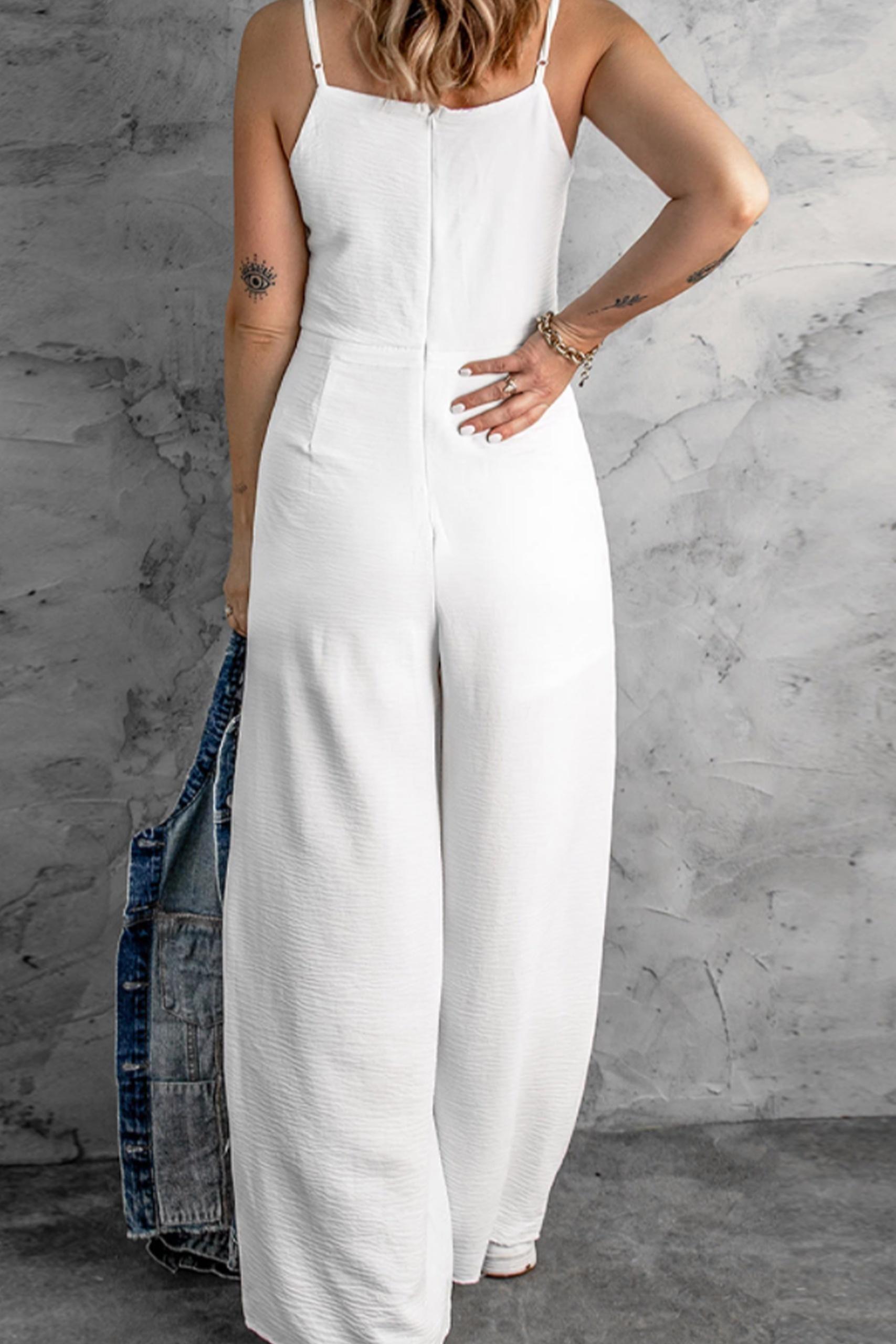 V neck overall jumpsuit ολόσωμη φόρμα σε κλασσικό λευκό χρώμα με spaghetti straps, φόδρα σορτς και ζωνάκι στη μέση.