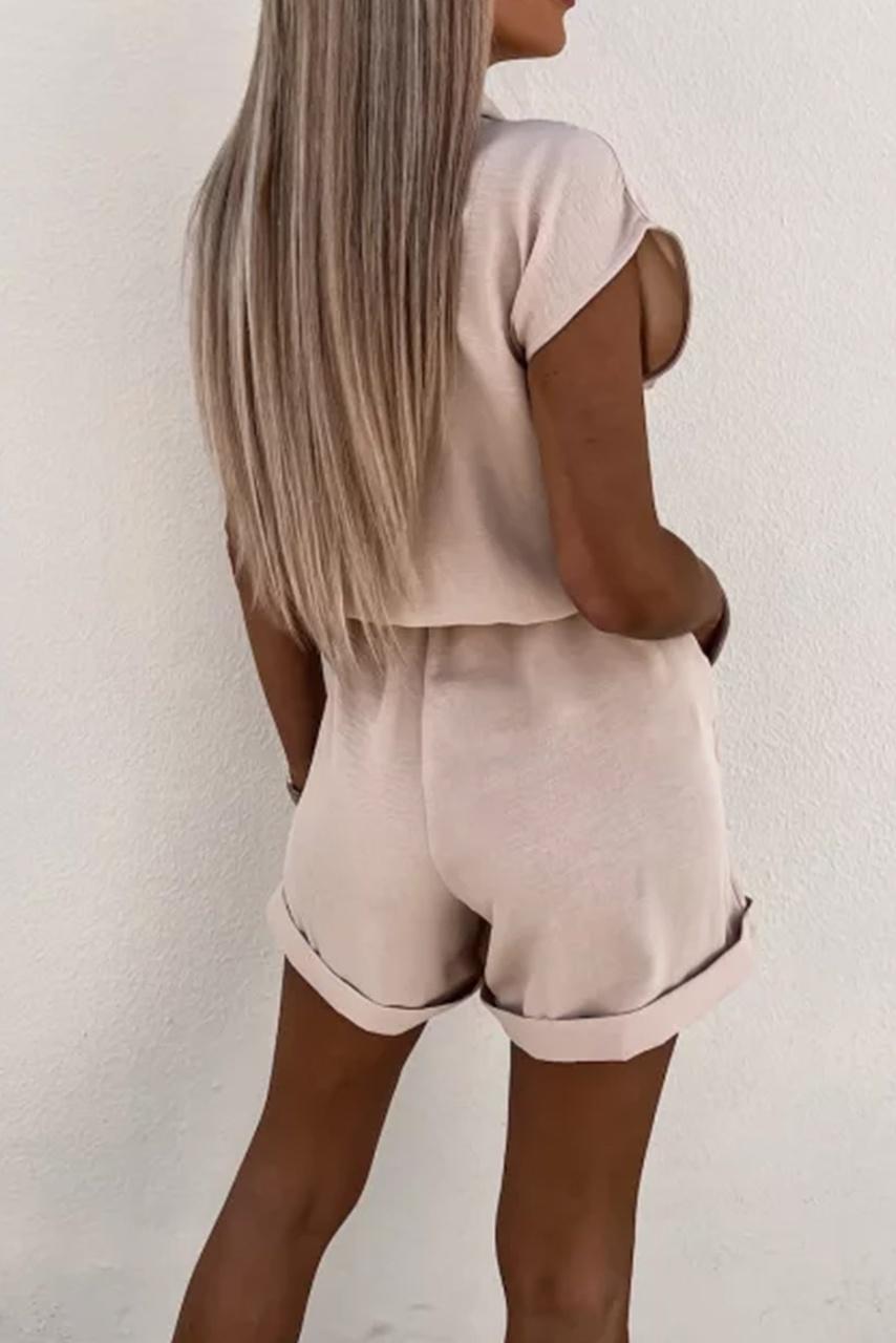 Smart casual office look V neck playsuit σε γήινες αποχρώσεις με κοντό μανίκι και στρίφωμα στο τελείωμα.