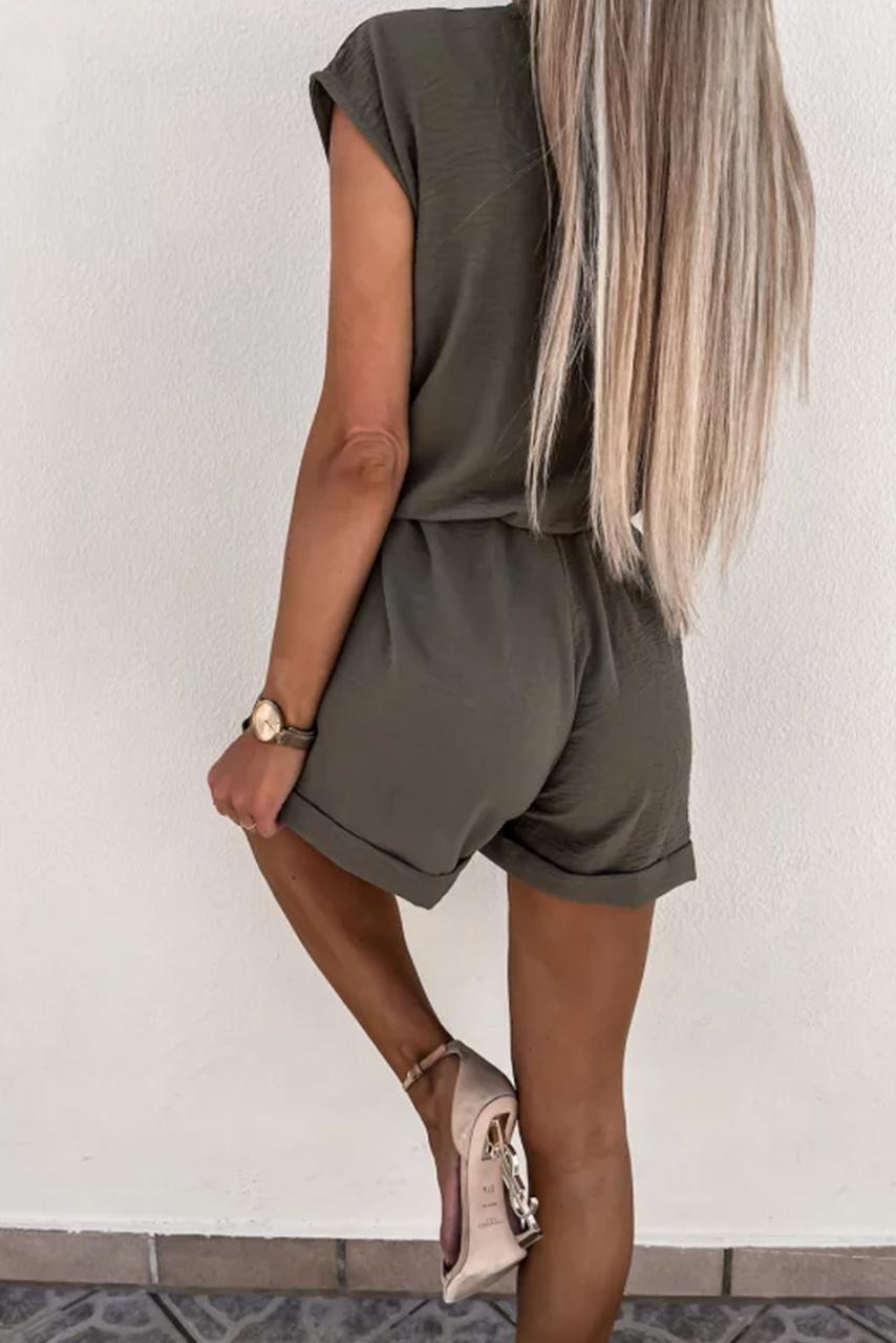• Φόρμα ολόσωμη κοντομάνικη μίνι | Λάστιχο στη μέση | V neck | Ζώνη ίδιου υφάσματος
