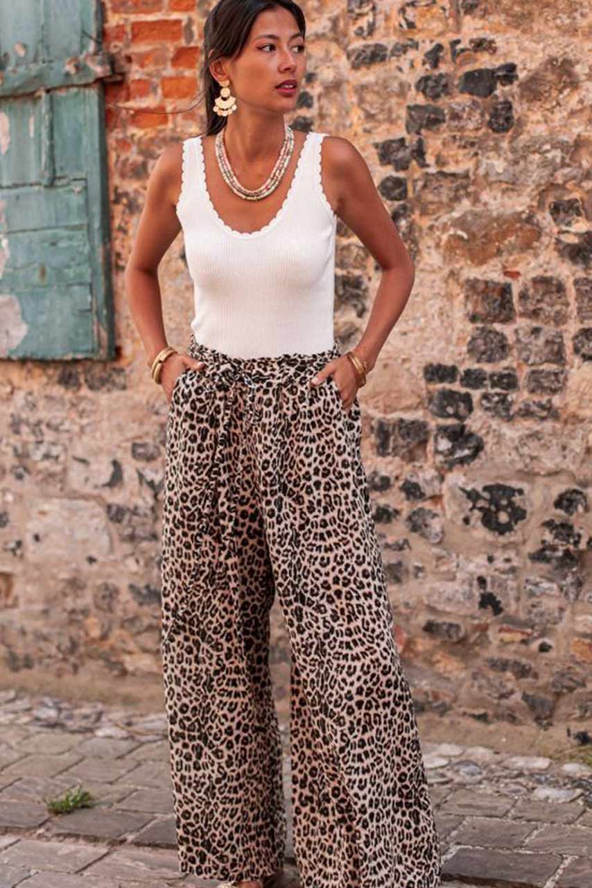Παντελόνα αέρινη με λάστιχο στη μέση σε μπεζ φόντο και με απόλυτα καλοκαιρινά animal print σχέδιο, για να το συνδυάζετε όλες τις ώρες της ημέρας. Έχει onesize νουμεράκι, που καλύπτει από S μέχρι L.
