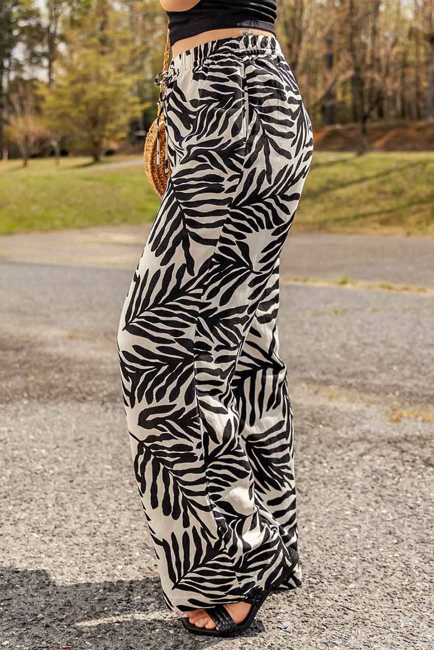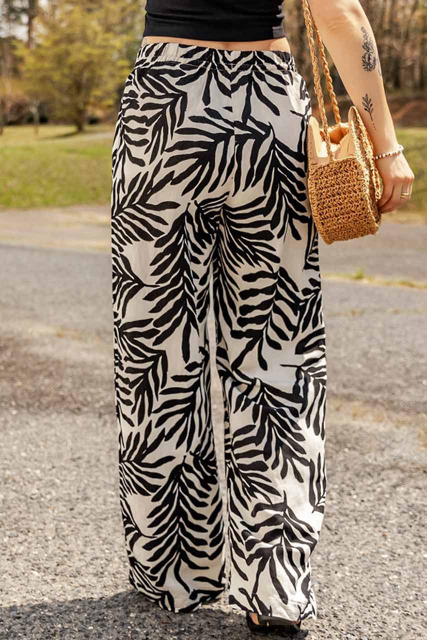 Tropical style wide leg αεράτη παντελόνα σε ψηλόμεση, ανοιχτή γραμμή με ελαστικό λάστιχο στην μέση και τσέπες.
