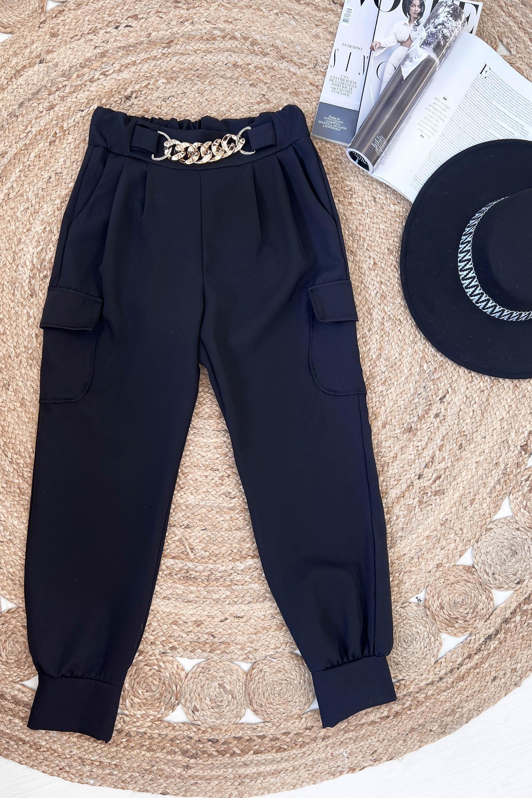 Casual chic military chain detail cargo παντελόνι σε μαύρο χρώμα με μεγάλες τσέπες στο πλάι και αλυσίδα στη μέση.