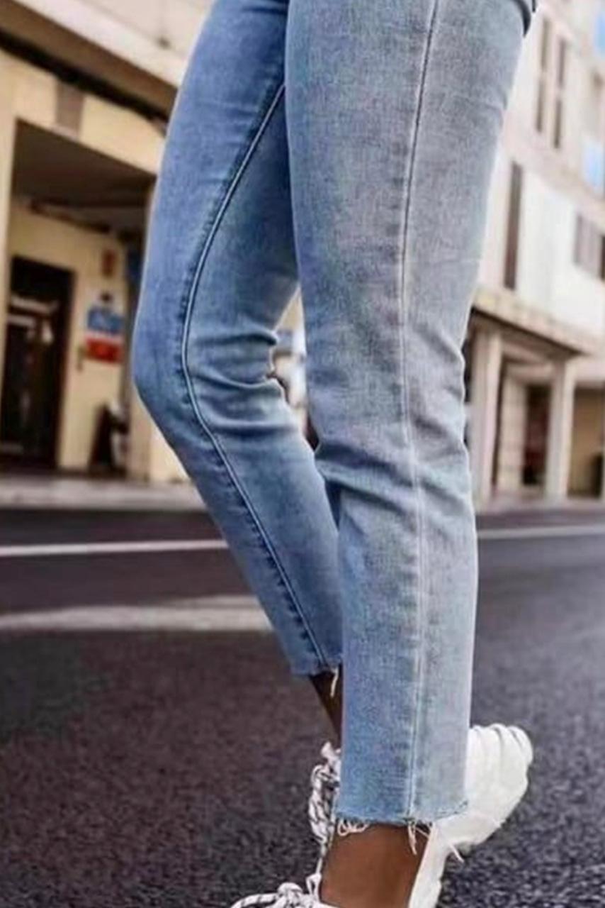 90s classic inspired denim τζιν σε ανοιχτό γαλάζιο με ankle cut κόψιμο και ξέφτια στο τελείωμα.