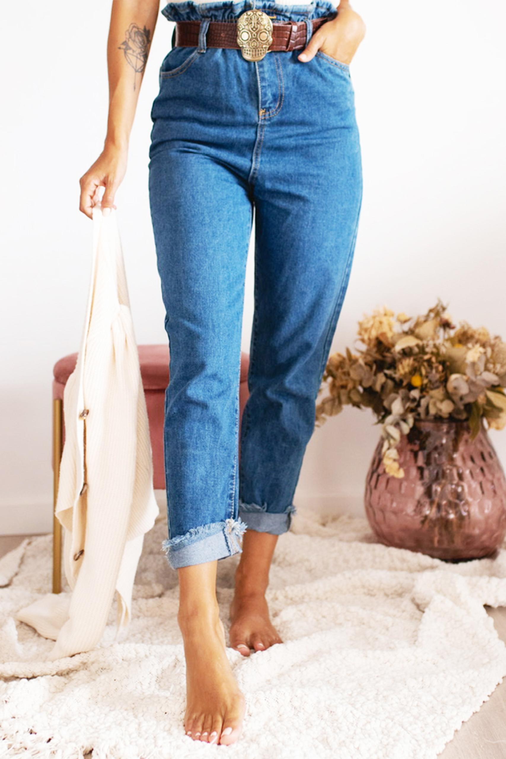 Ψηλόμεσο τζιν σε κλασσικό μπλε χρώμα με λάστιχο βολάν στη μέση και τσέπες μπροστά και πίσω.