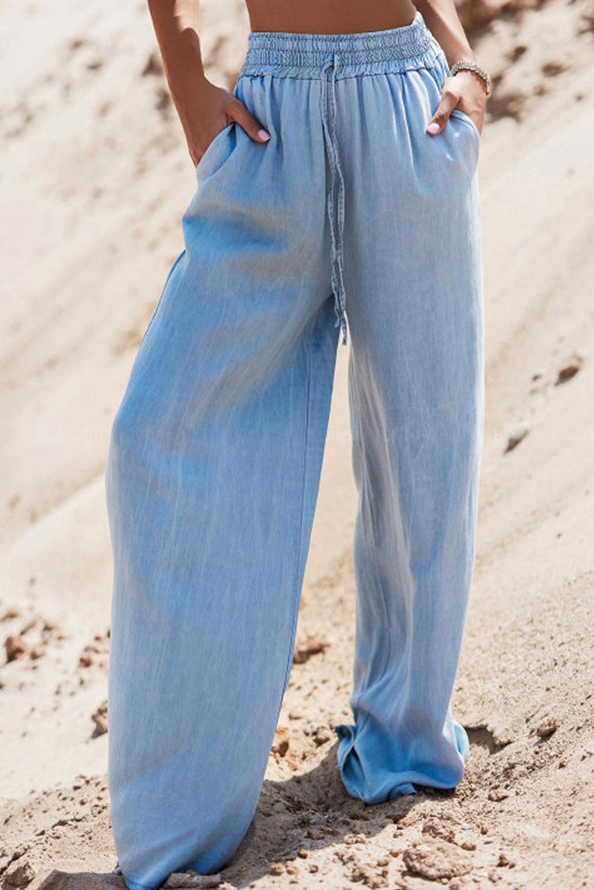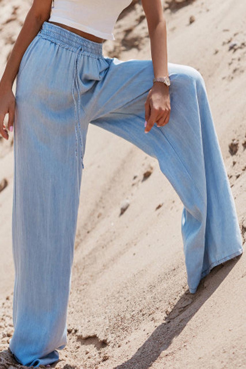 Ψηλόμεση τύπου jean παντελόνα αεράτη με ελαστικό λάστιχο στην μέση και τσέπες.