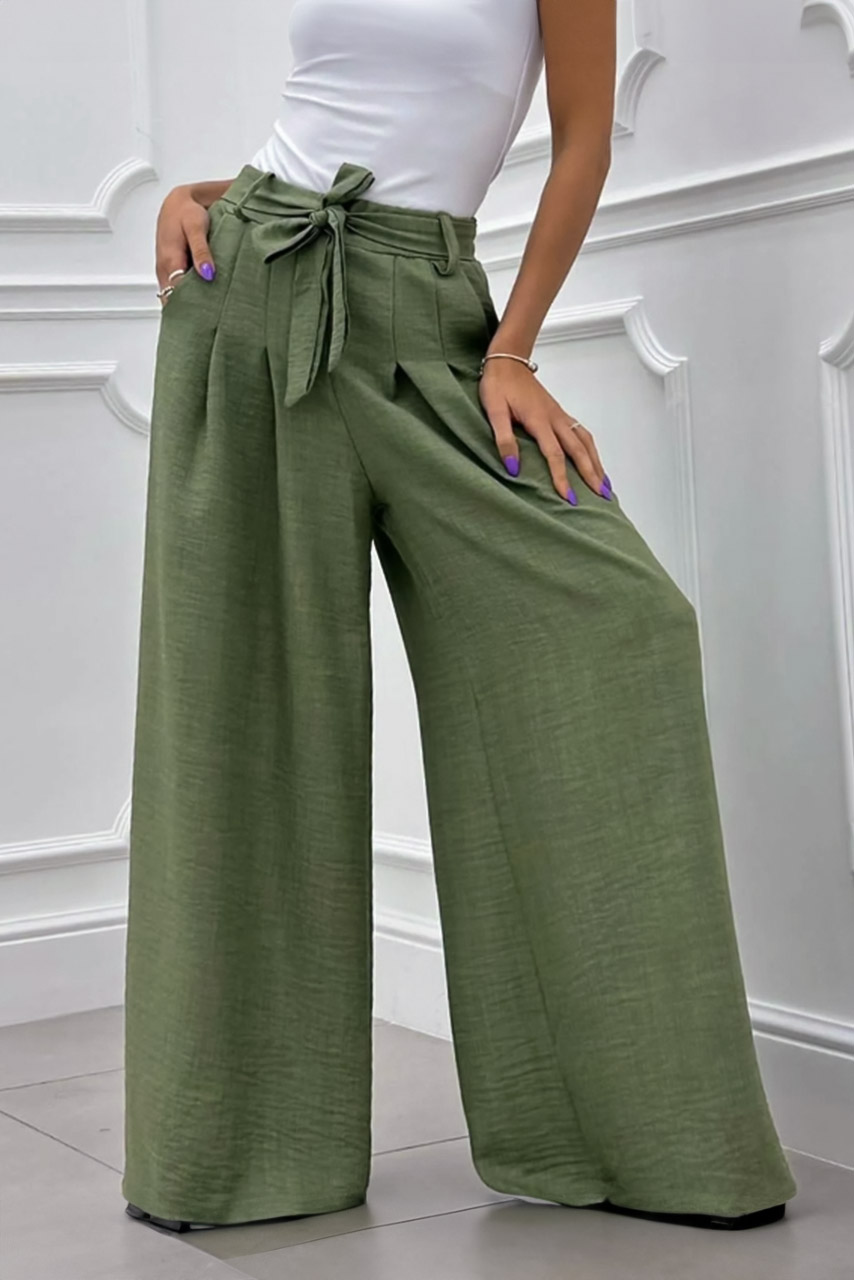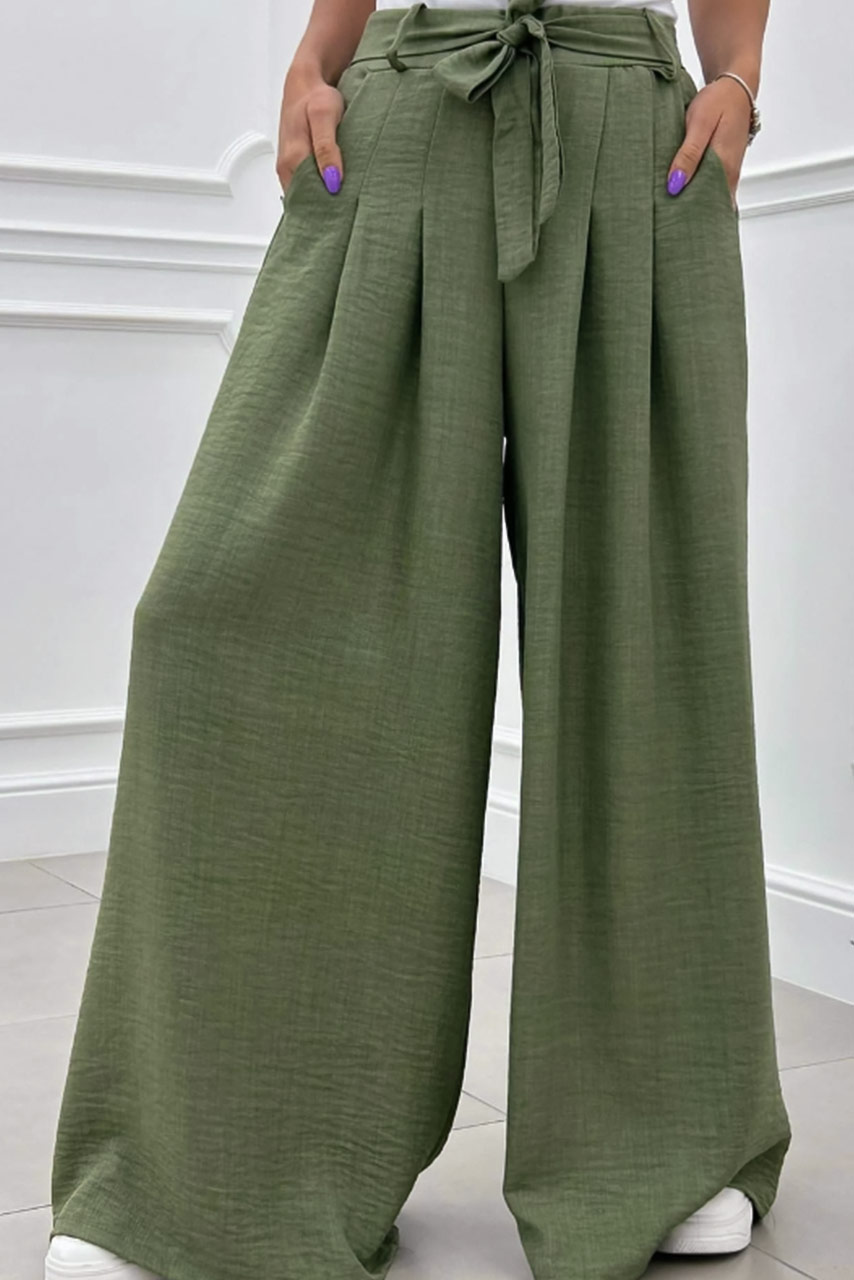 Παντελόνα φραδιά χακί με πιέτες και ζωνάκι ίδιου υφάσματος για άνετες και στυλάτες εμφανίσεις.