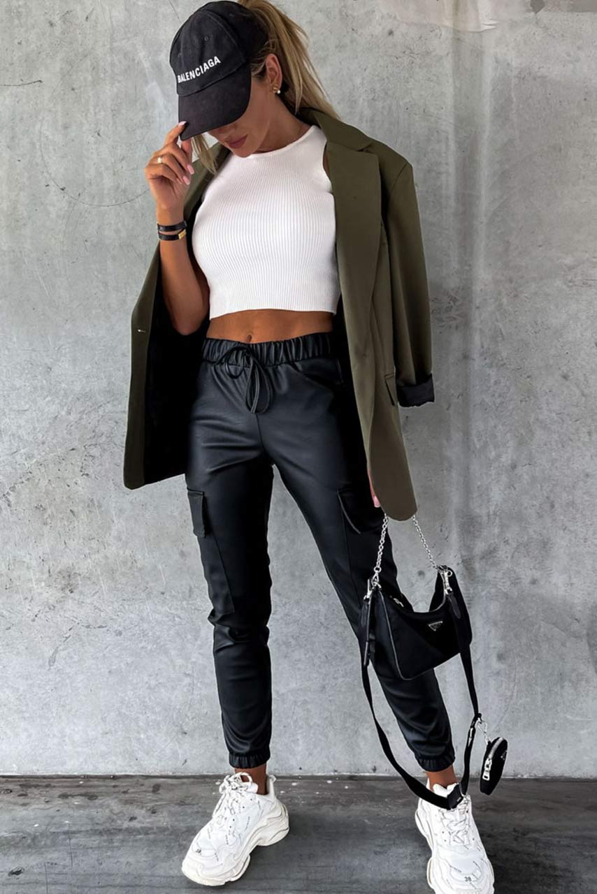 Glam casual eco leather cargo παντελόνι σε μαύρο χρώμα, ίσια γραμμή με λάστιχο στη μέση και μεγάλες τσέπες.