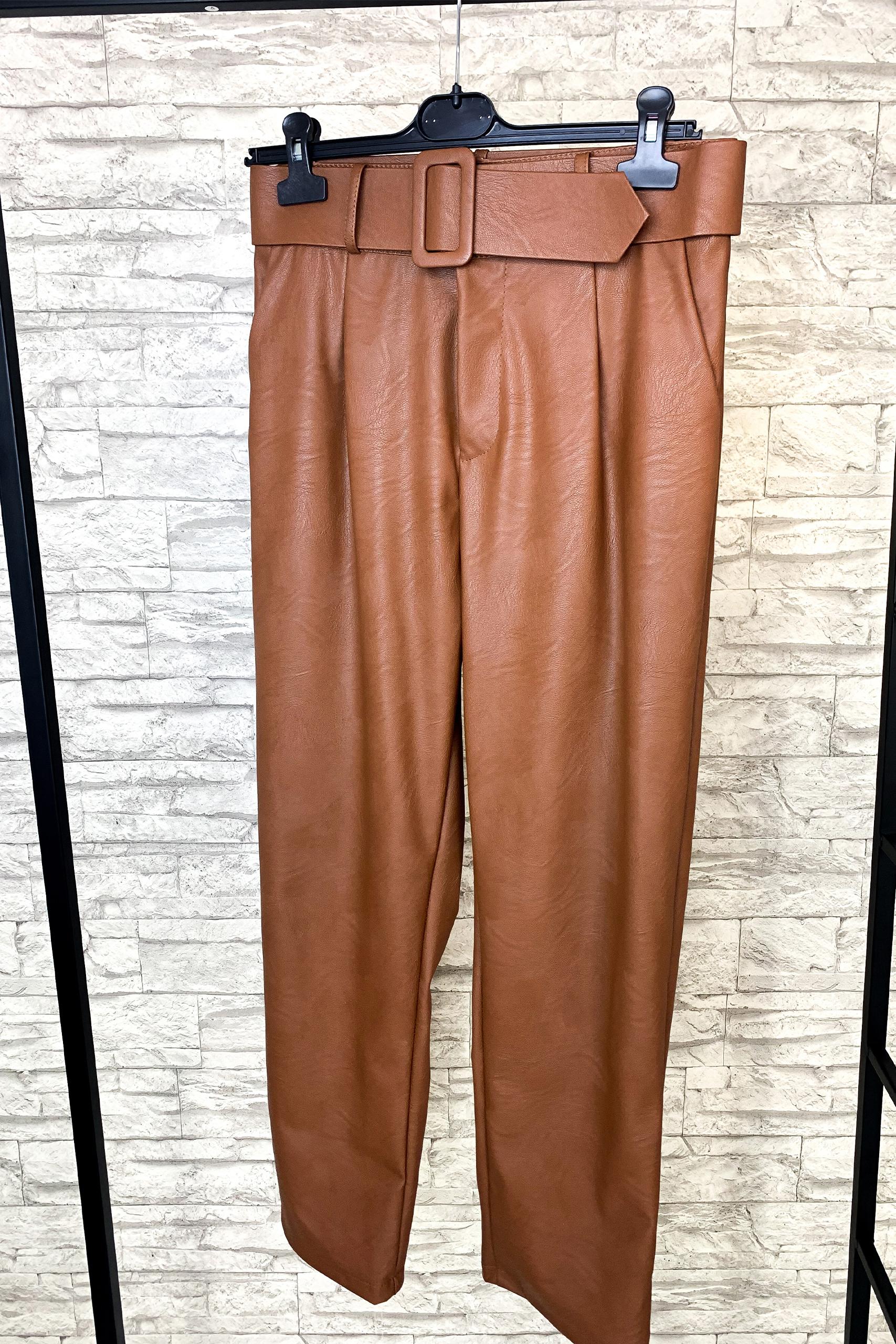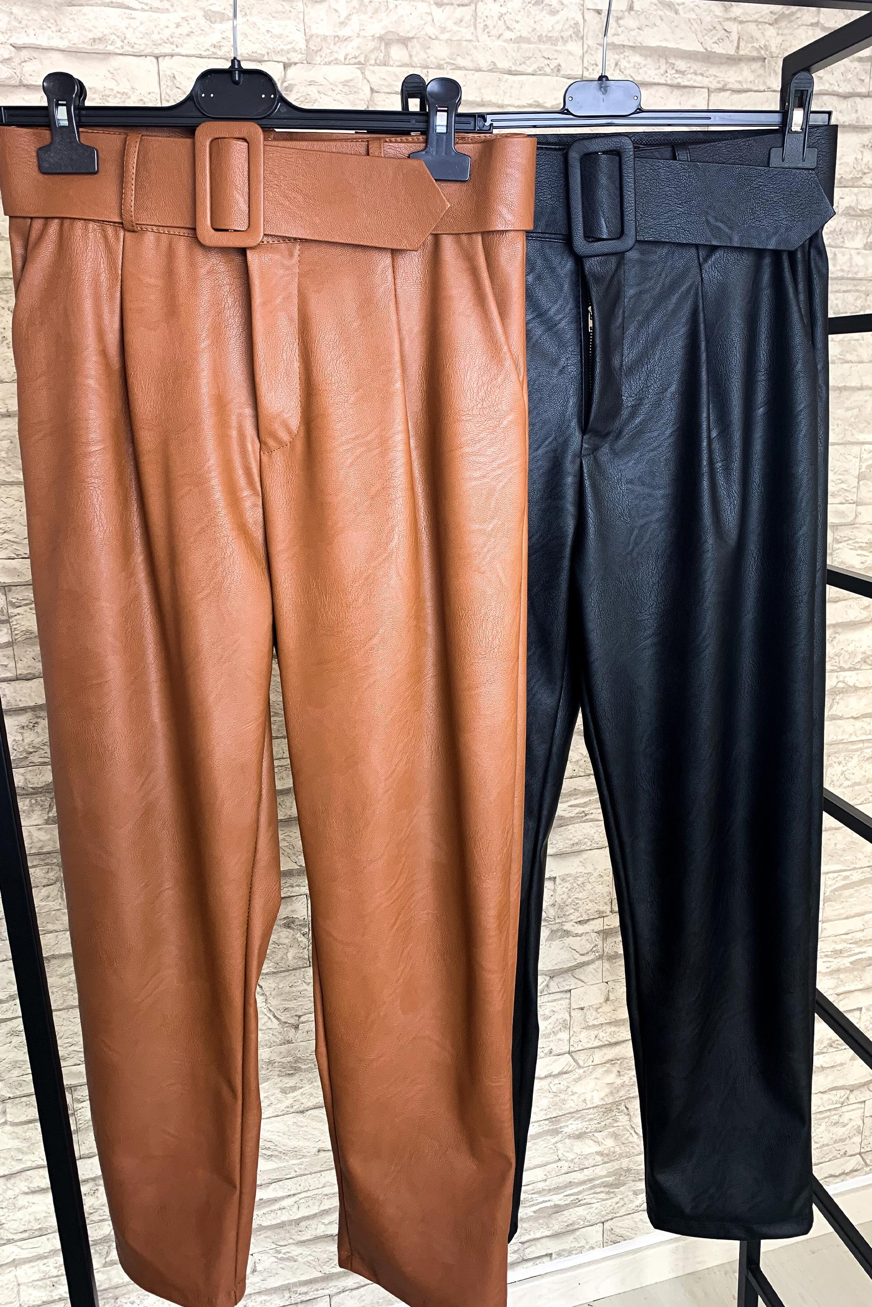 Leather cigarette pants σε trendy αποχρώσεις με όψη δερματίνης και ζώνη με μεγάλη αγκράφα.