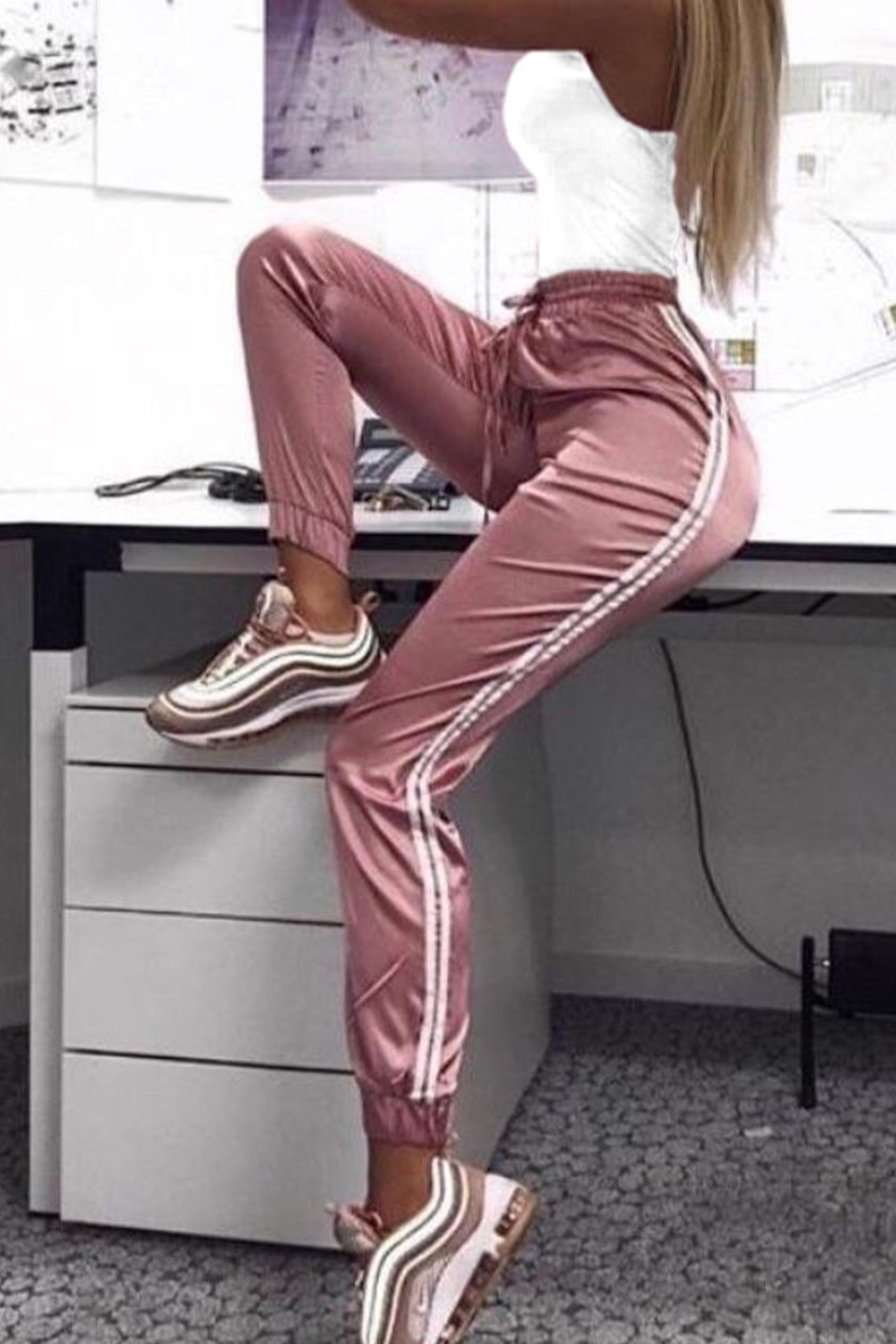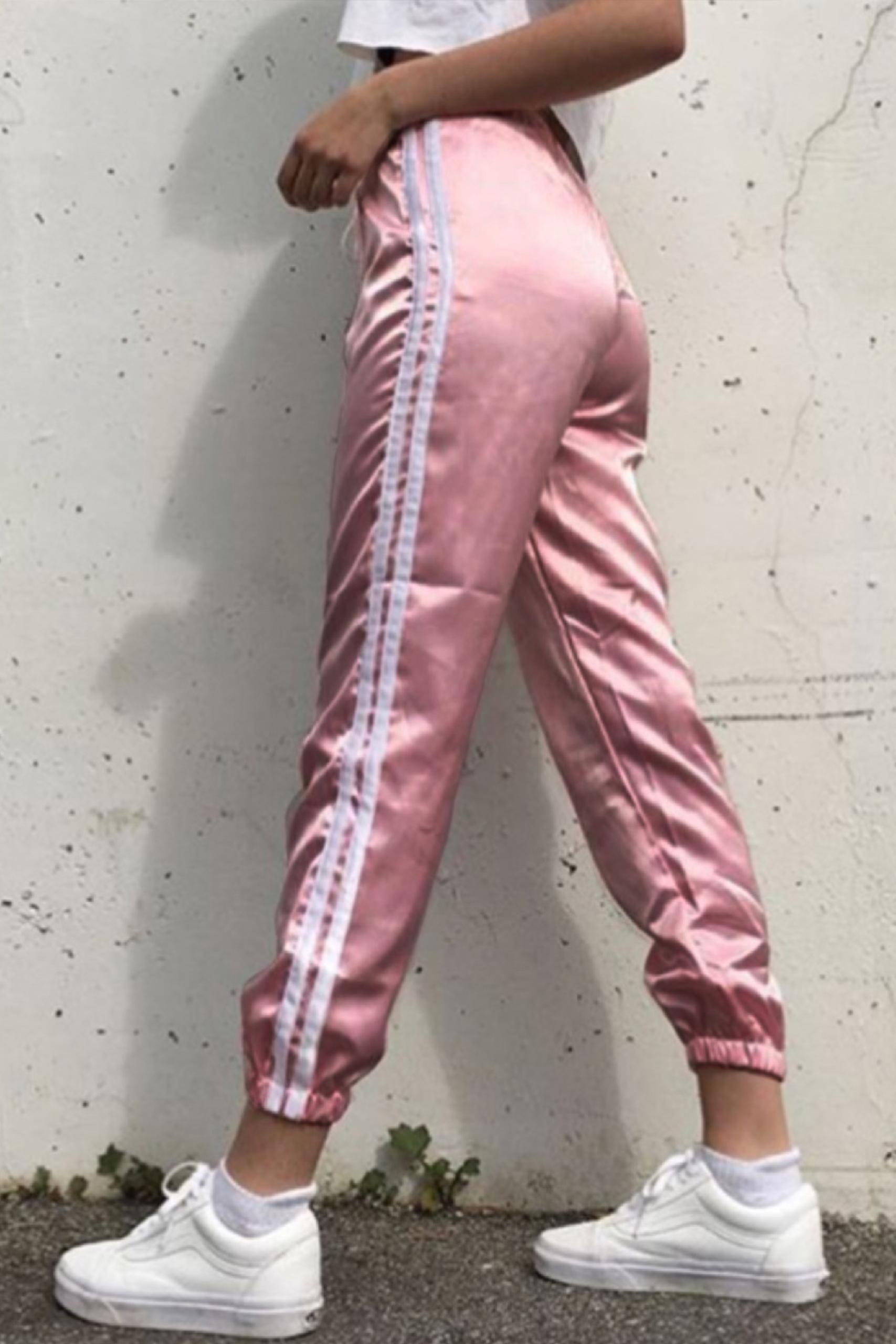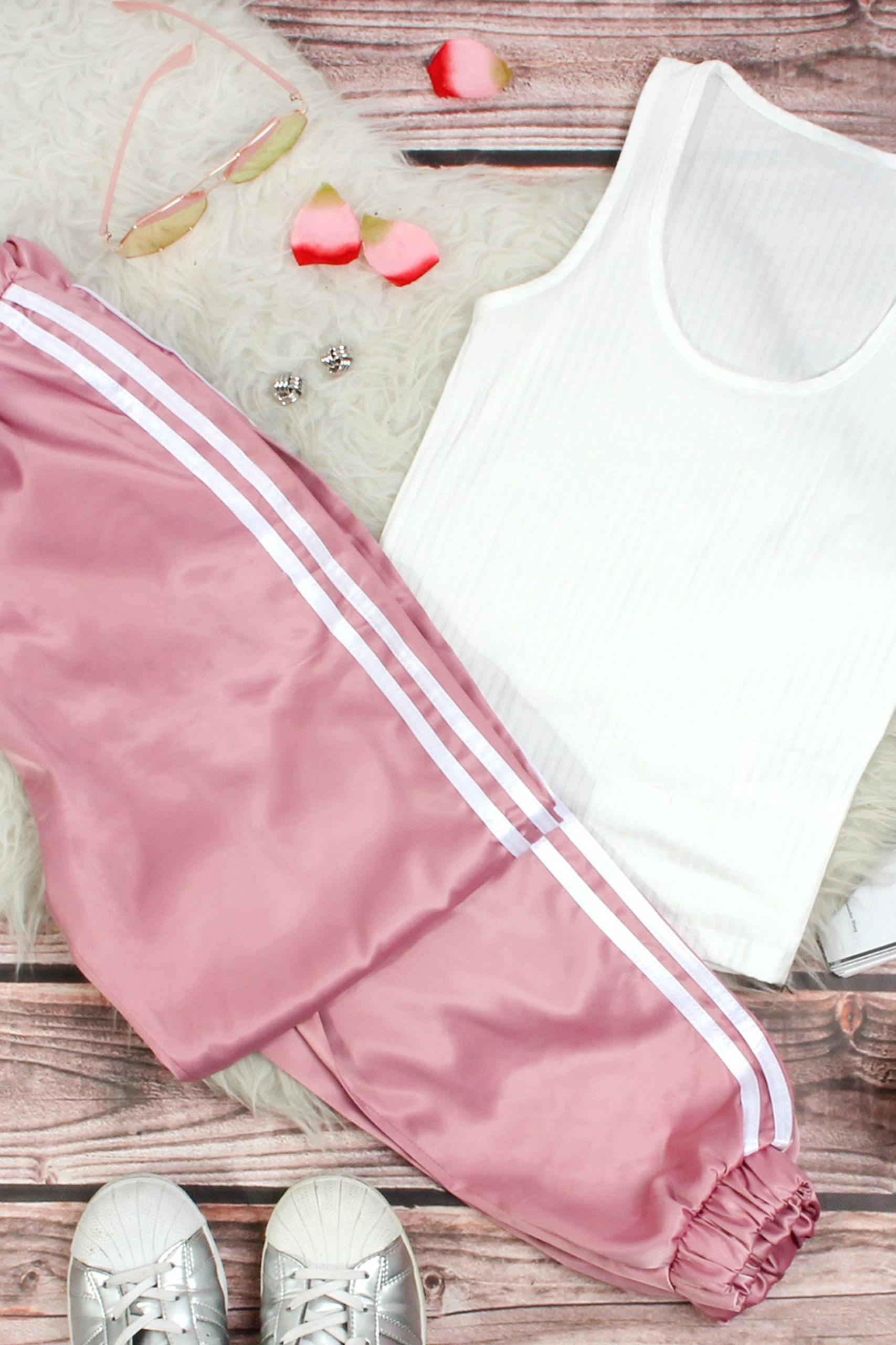 Metallic casual παντελόνι σε έντονη ροζ απόχρωση με λευκές ρίγες στο πλάι σετ με rib λευκό tank top.