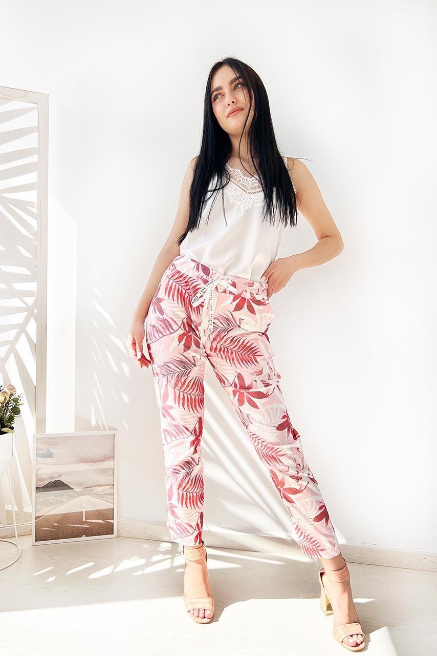 Εμπριμέ παντελόνι σαλβάρι με λάστιχο στη μέση και στο τελείωμα σε έντονα ανοιξιάτικα χρώματα με μεγάλα all over prints.