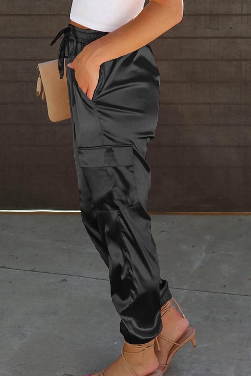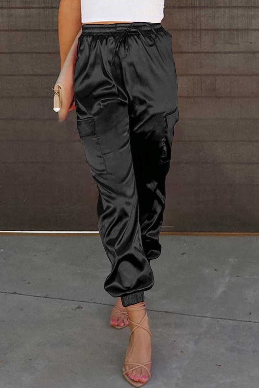 Παντελόνι σατέν cargo με τσέπες και λάστιχο στην μέση. Ιδανικό για βραδινές βόλτες και σικάτες εμφανίσεις.