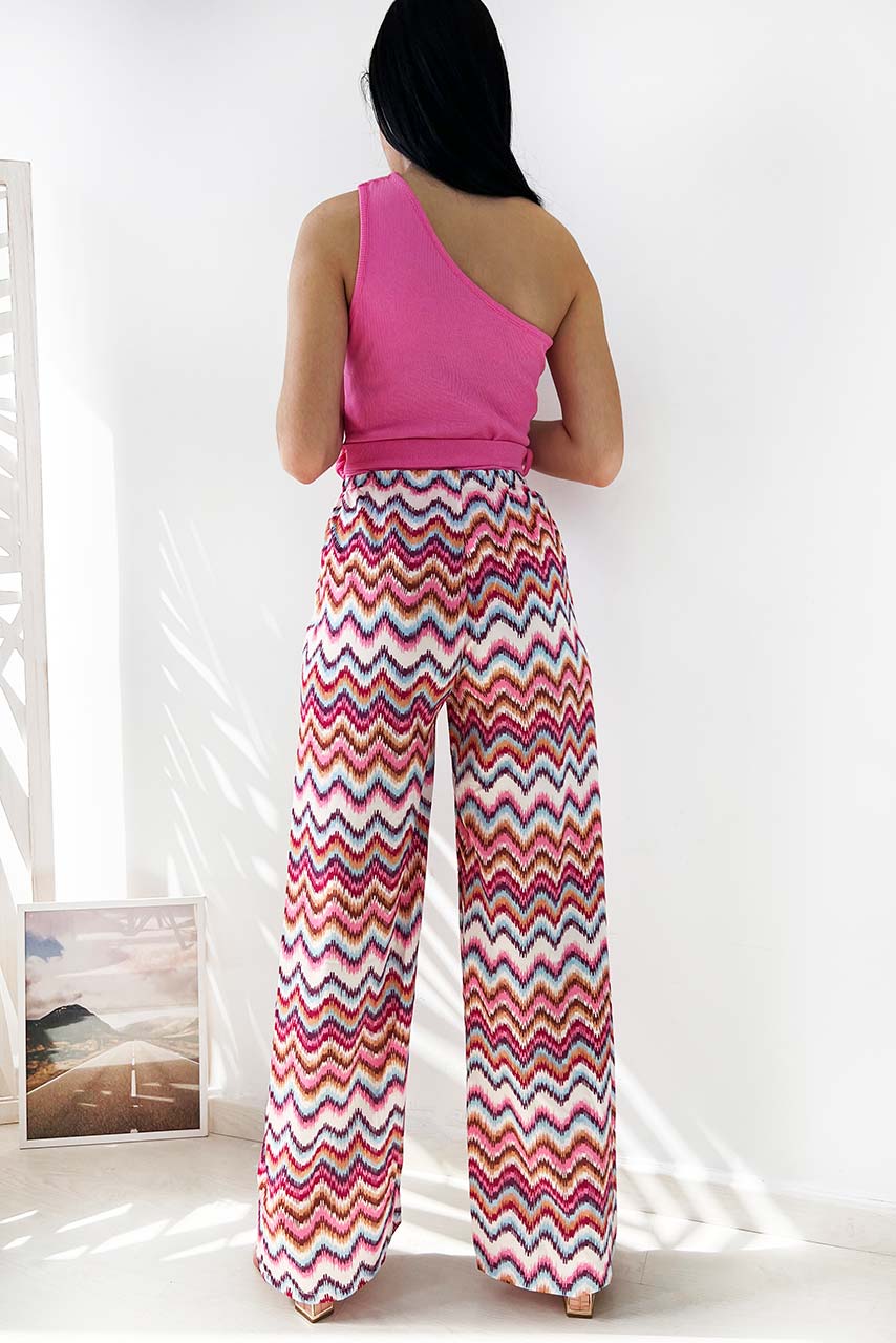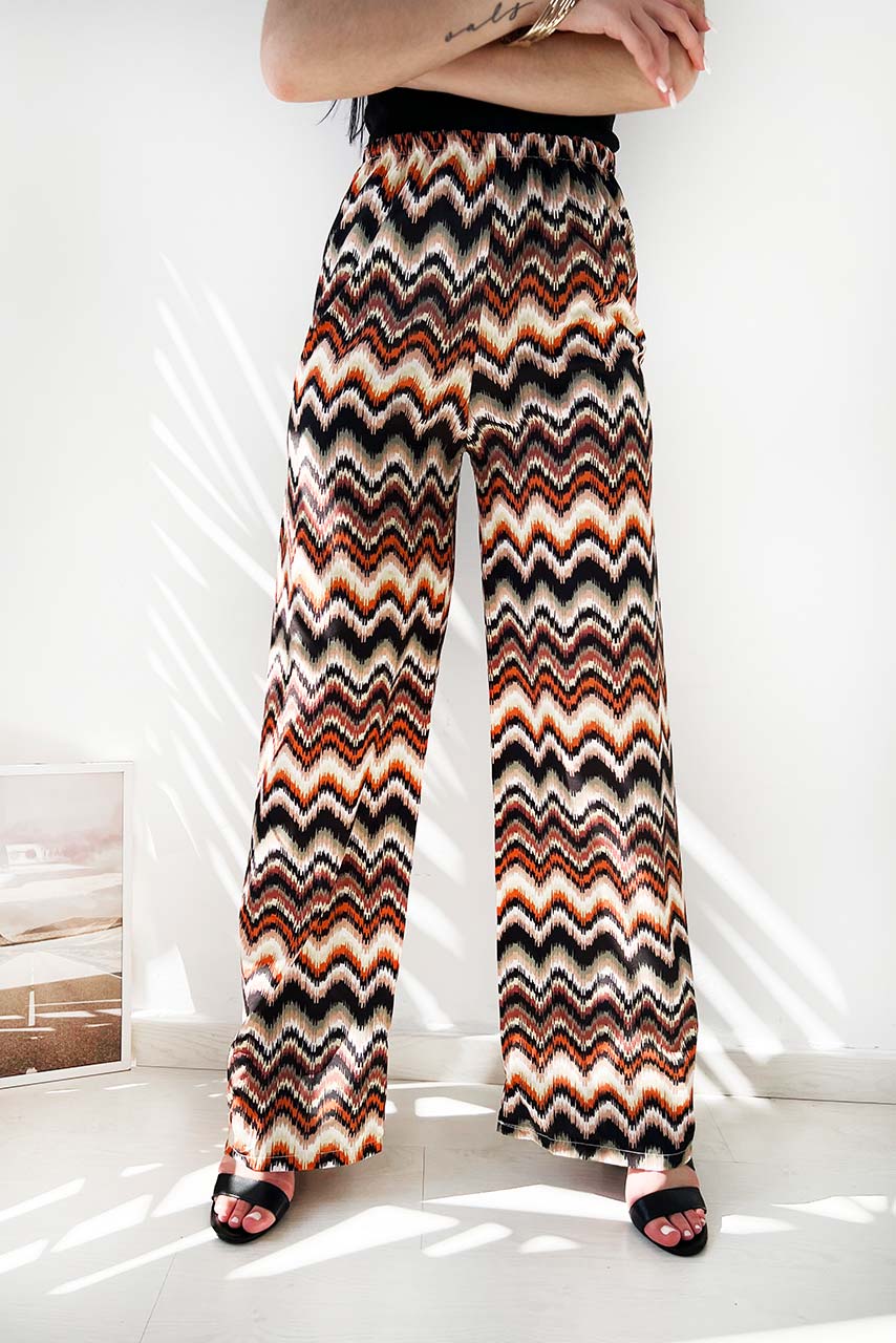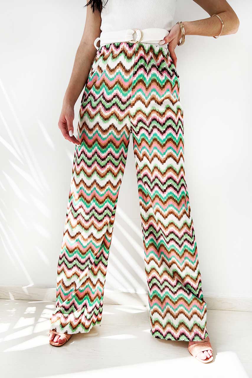Boho glam εμπριμέ flare pants με λάστιχο στη μέση σε τρεις καλοκαιρινούς συνδυασμούς αποχρώσεων για να το συνδυάζετε όλες τις ώρες της ημέρας.