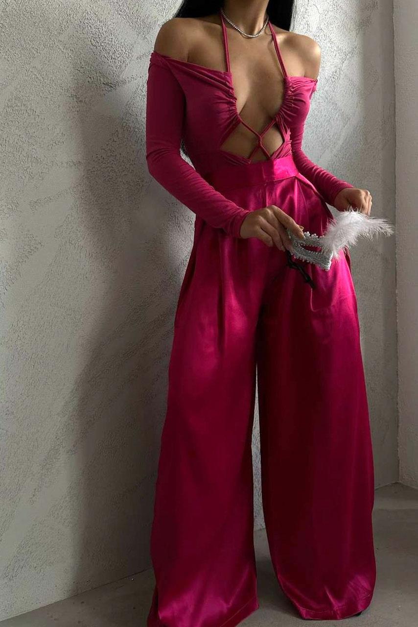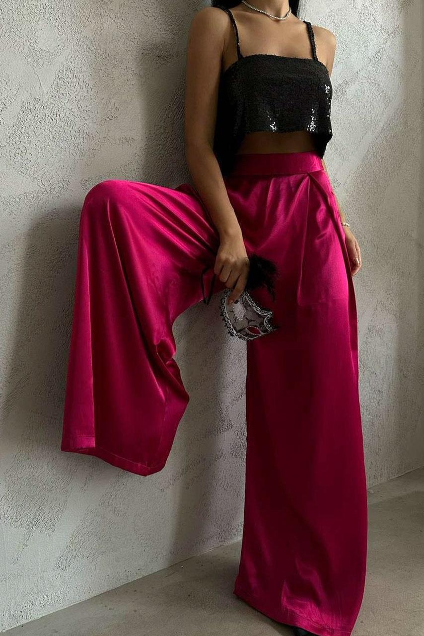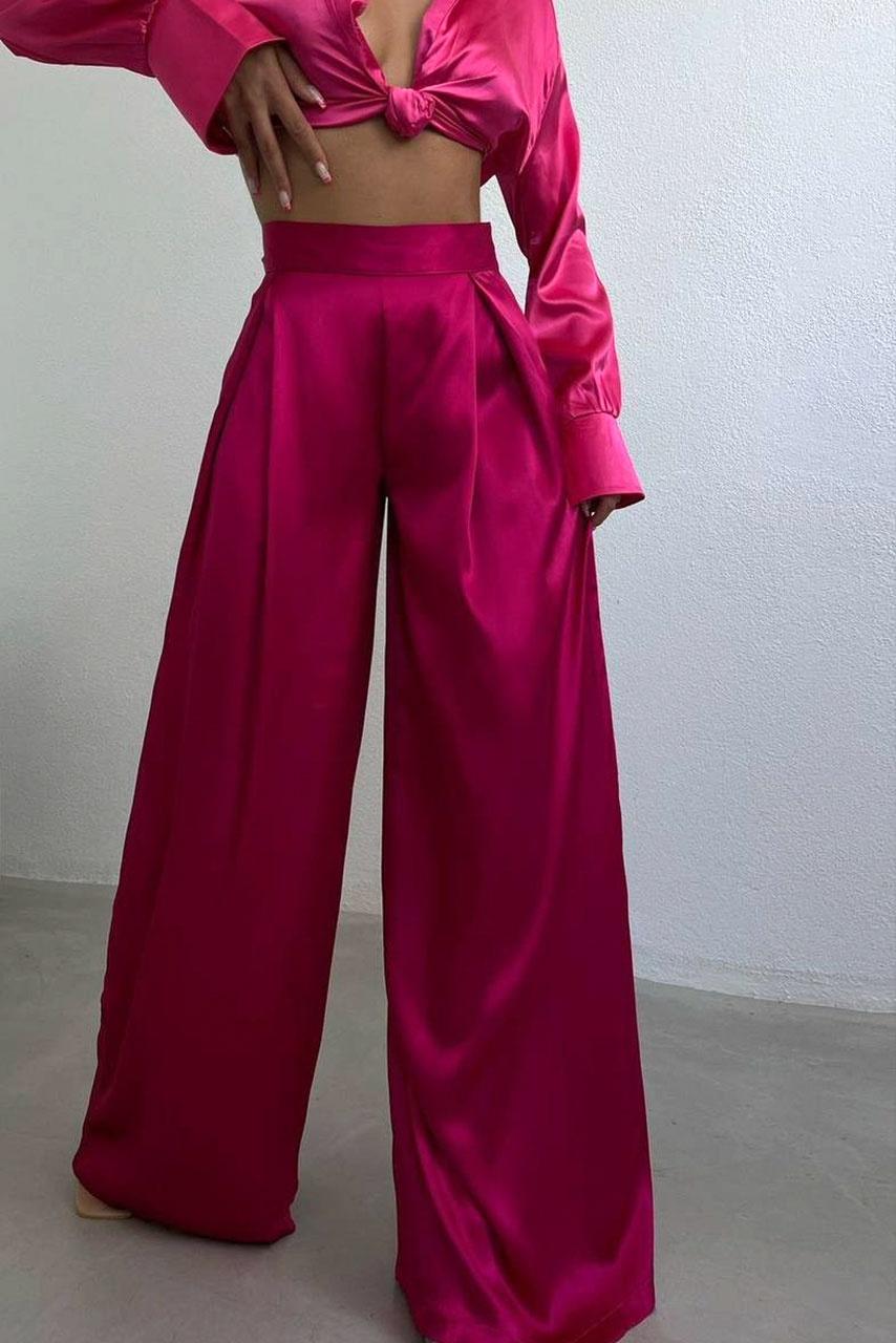 Glam vintage wide leg σατέν παντελόνα σε ανοιχτή γραμμή με απαλές πτυχές on top σε φούξια απόχρωση.