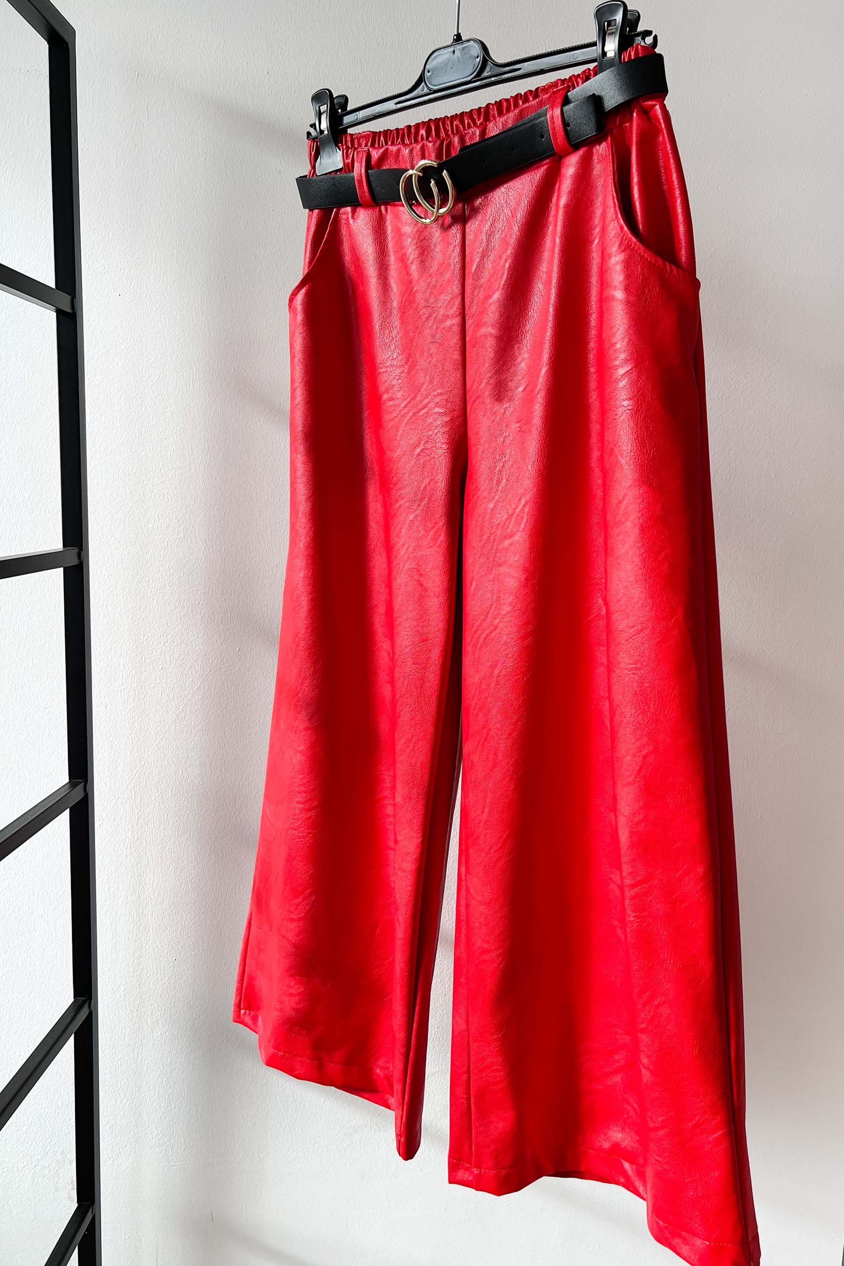 Wide legged παντελόνι από eco leather ύφανση σε total λευκό και κόκκινο χρώμα με άνοιγμα στο ύψος της γάμπας.