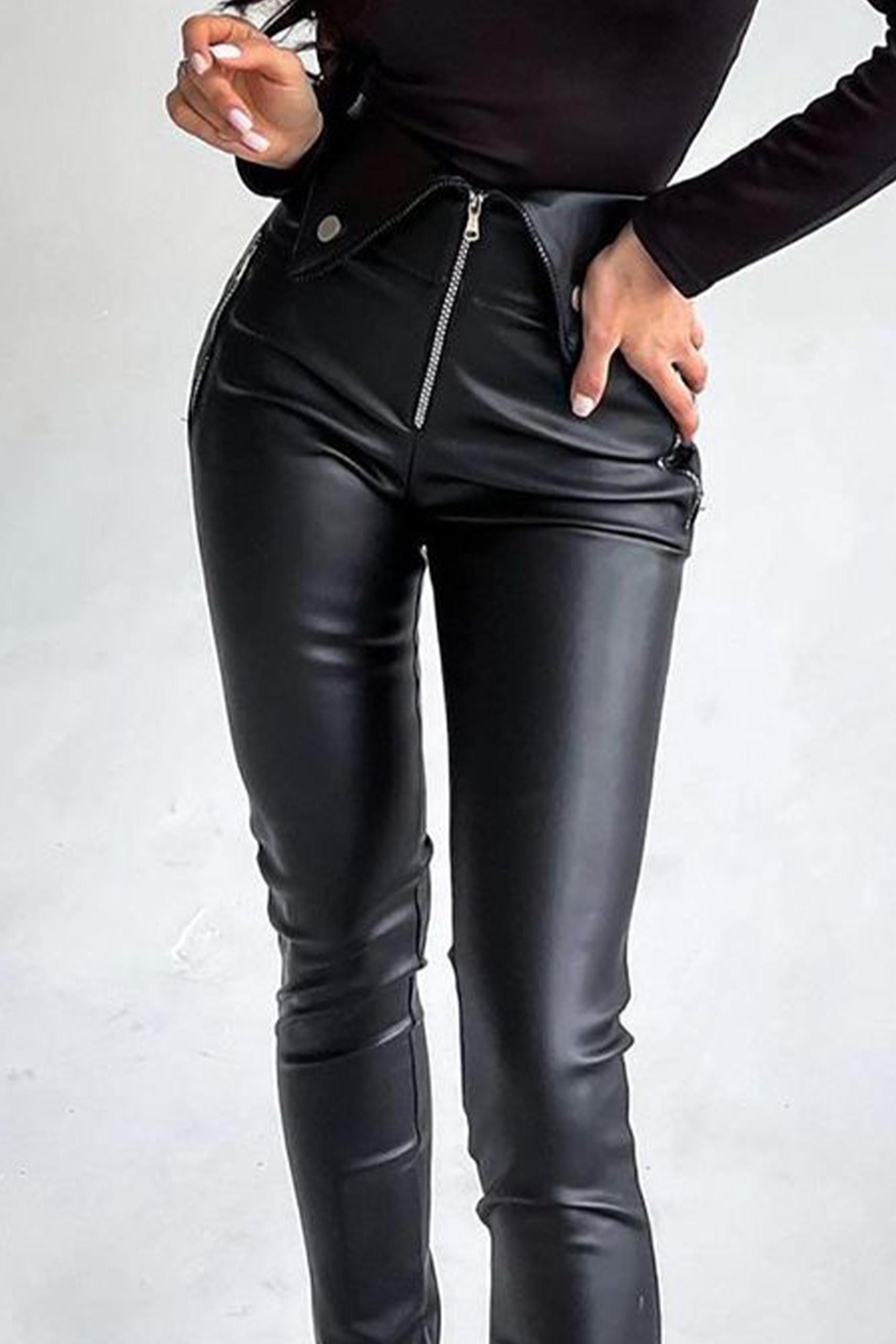 Rock glam zip closure leather παντελόνι με ασημί μεγάλα φερμουάρ στη μέση και στις τσέπες και πιέτα on top.