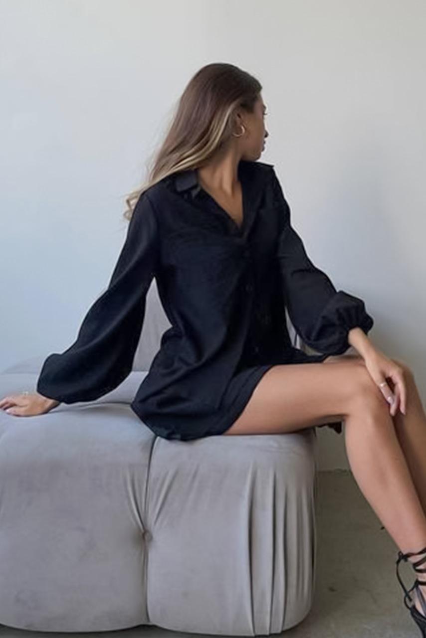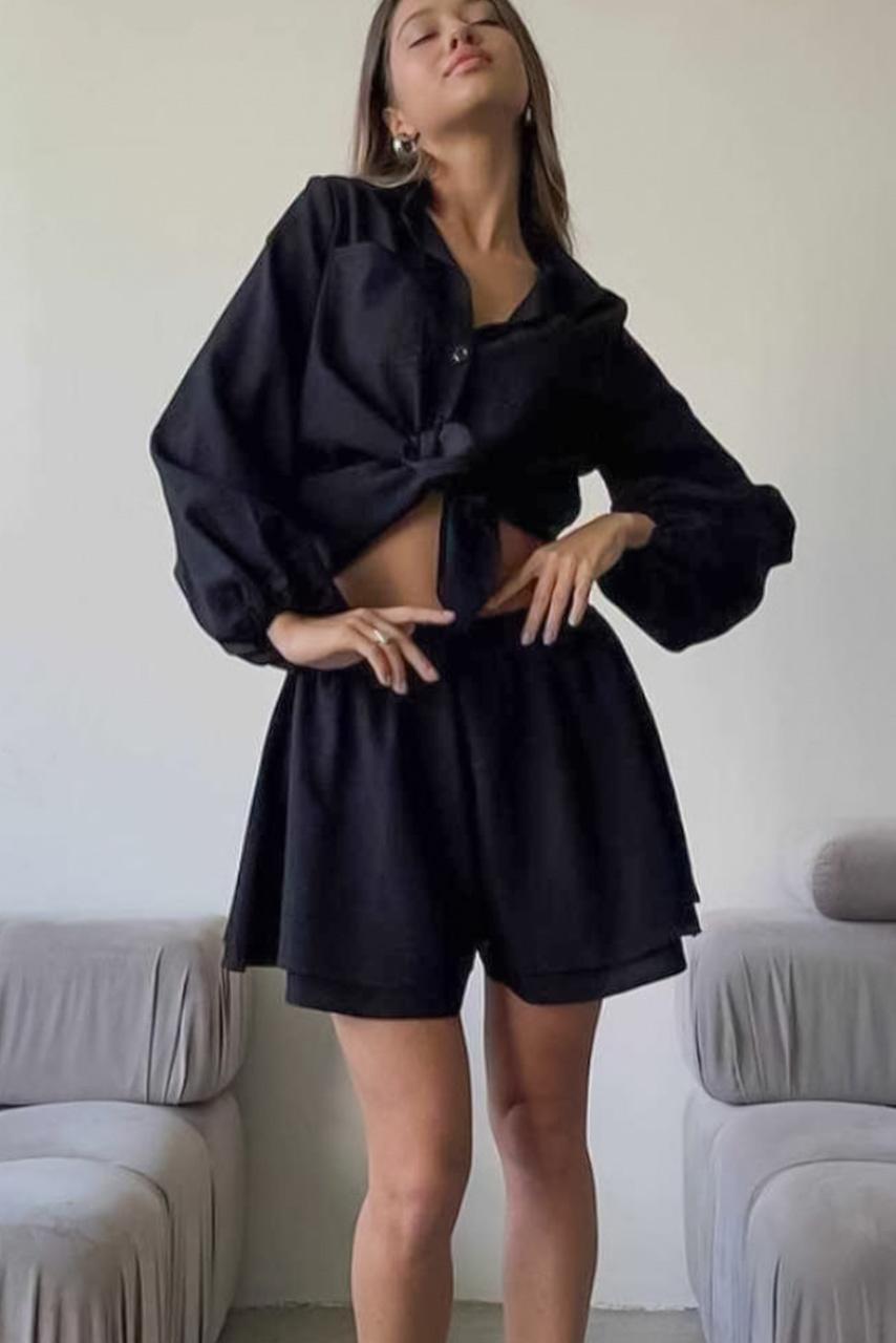 Σετάκι μαύρο αέρινο με τοπ και σορτσάκι. Το τοπάκι έχει ελαφρώς φουσκωτά μανίκια με λάστιχο, κουμπάκια κατά μήκος και τσέπες. Το σορτσάκι έχει ελαστικό λάστιχο στην μέση. Ένα υπέροχο σετάκι για τις πρωινές και βραδινές σου βόλτες.