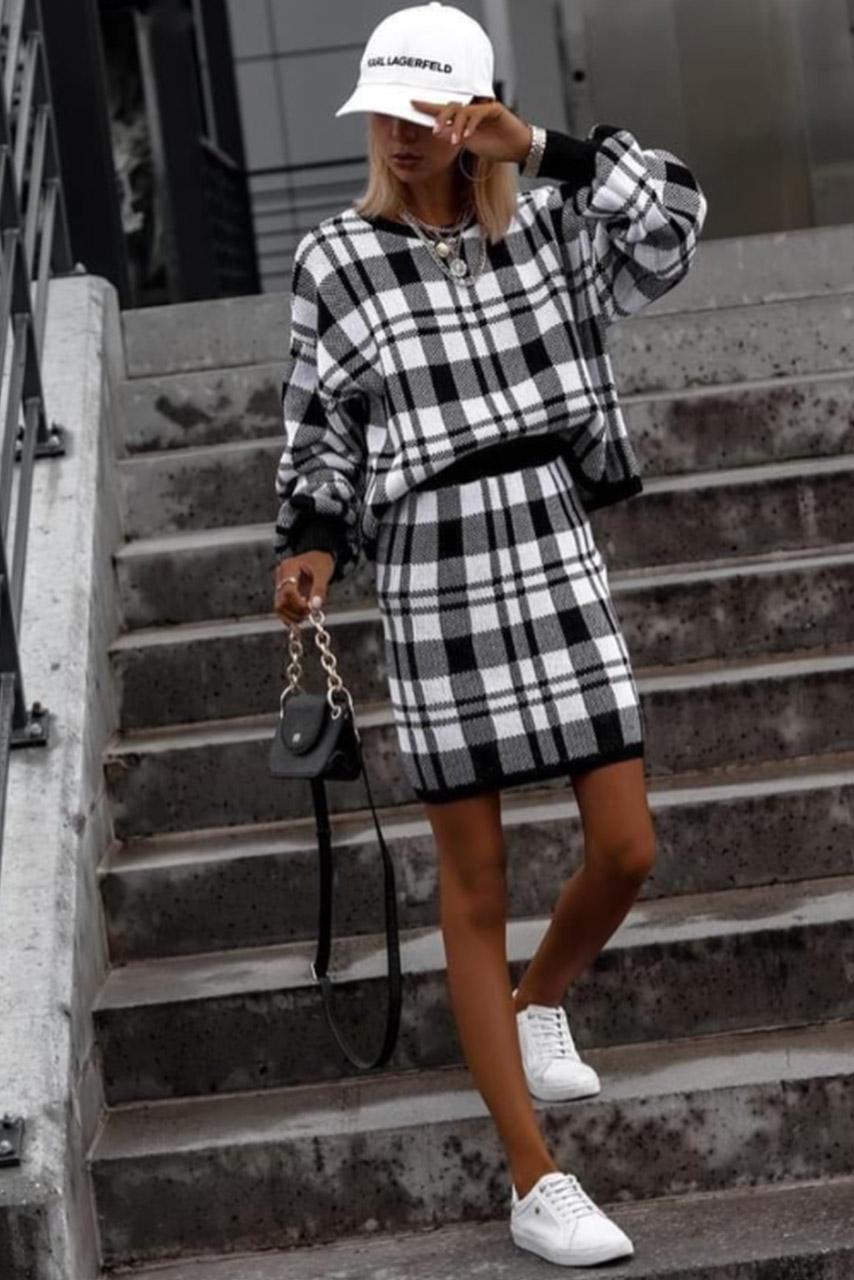 Casual chic σετ σε ασπρόμαυρη απόχρωση με τοπ στρογγυλή λαιμόκοψη και pencil φούστα με λάστιχο στη μέση.