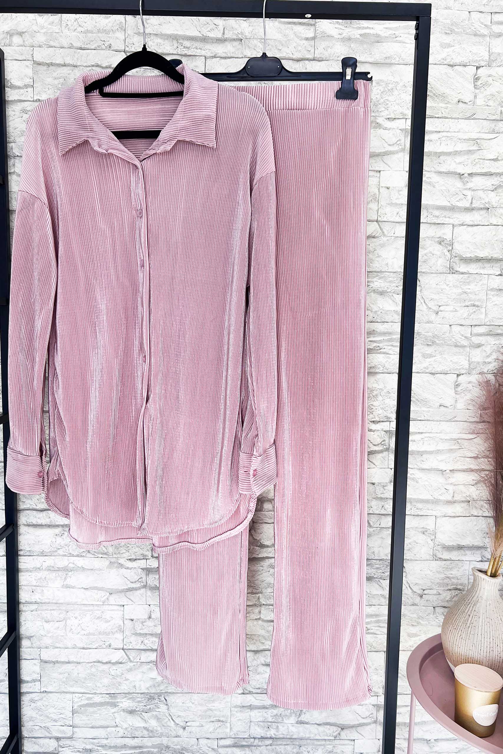 Casual ruched σατινέ σετ με loose πουκάμισο και flare παντελόνι σε πολλές αποχρώσεις.