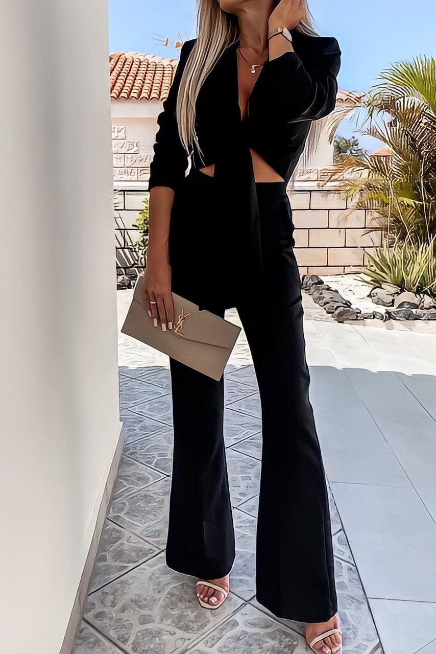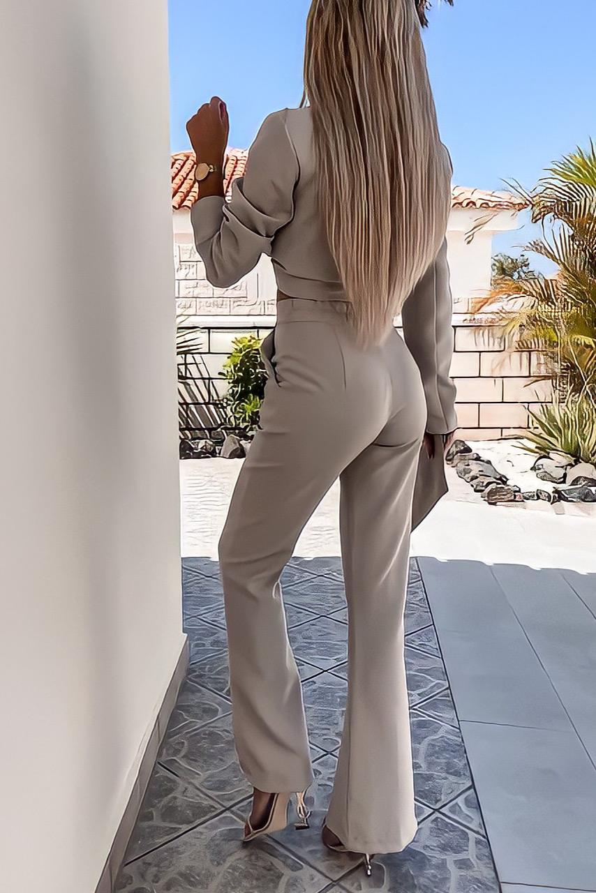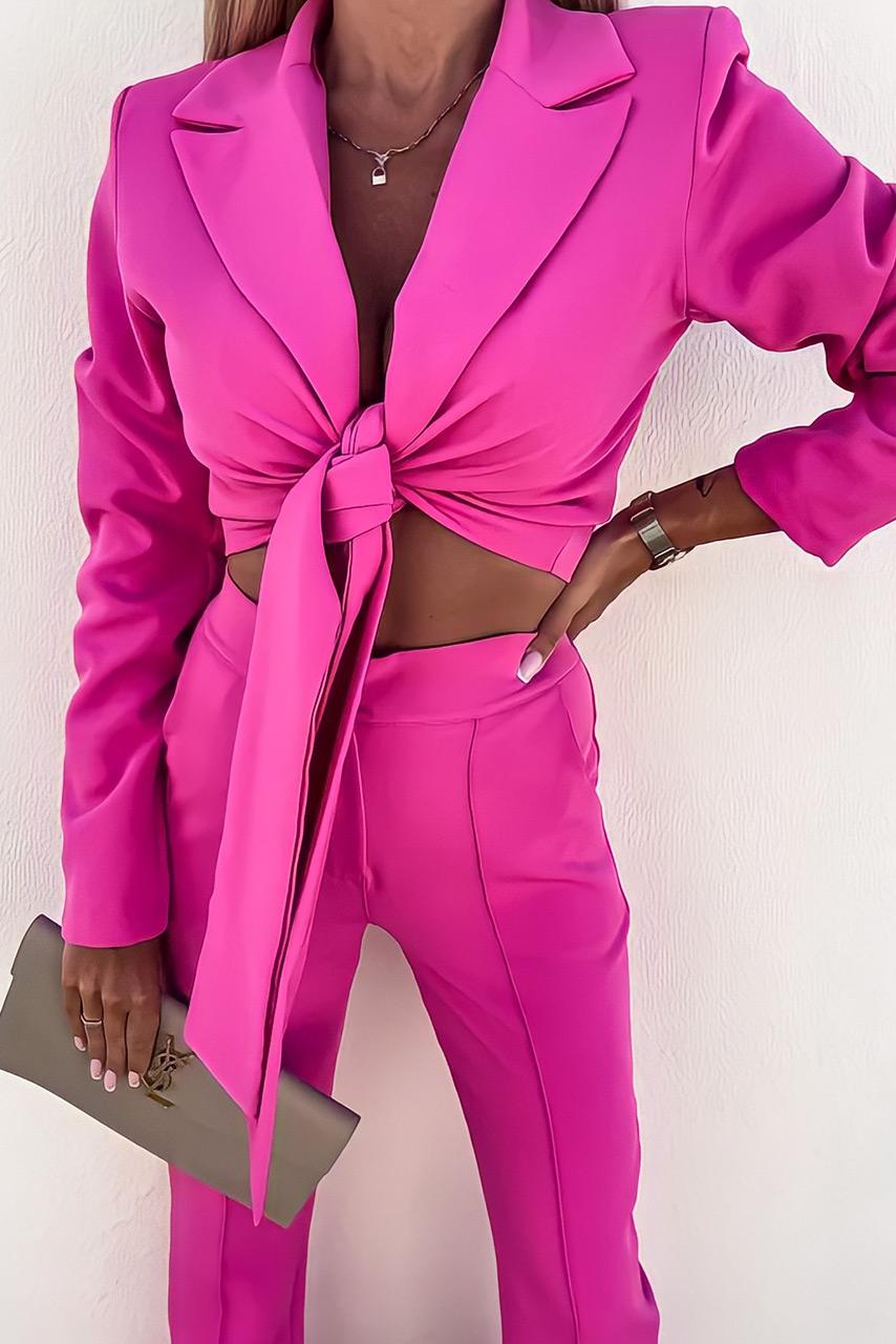 Glam casual σετ σε έντονες αποχρώσεις με cropped σακάκι natural tie που δένει μπροστά με καμπάνα παντελόνι.