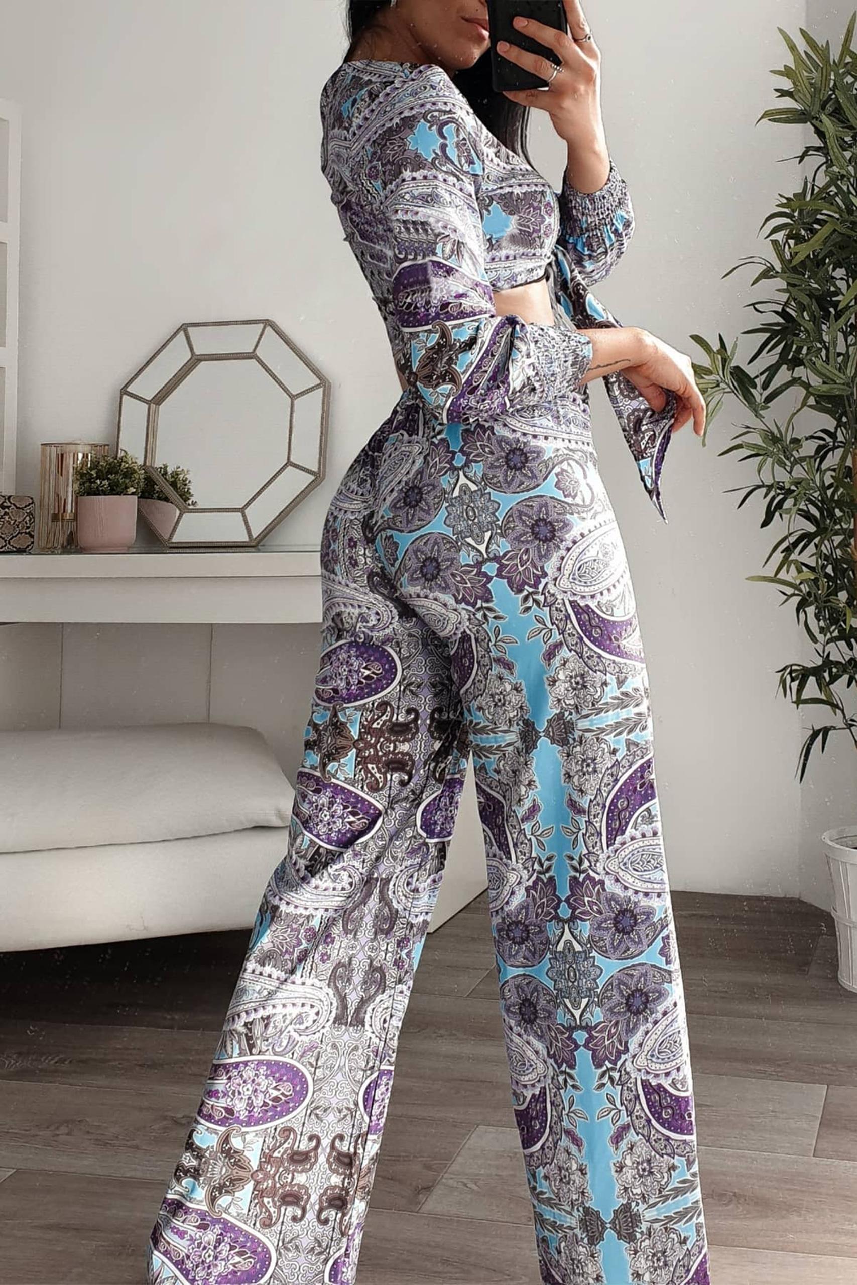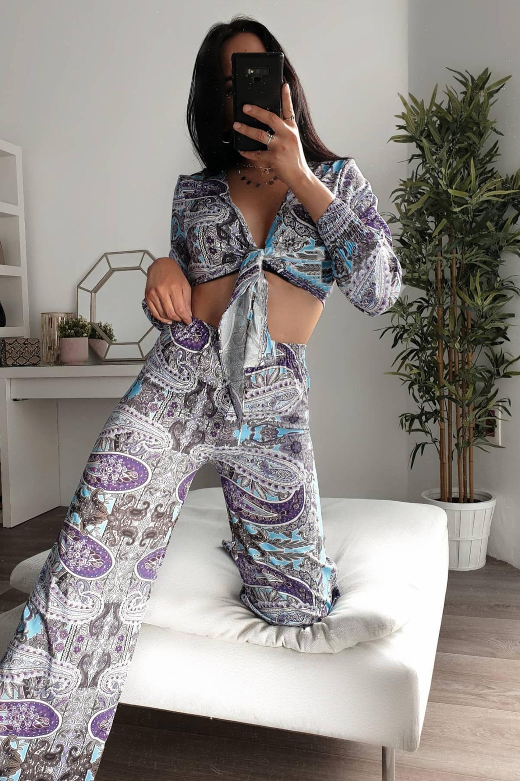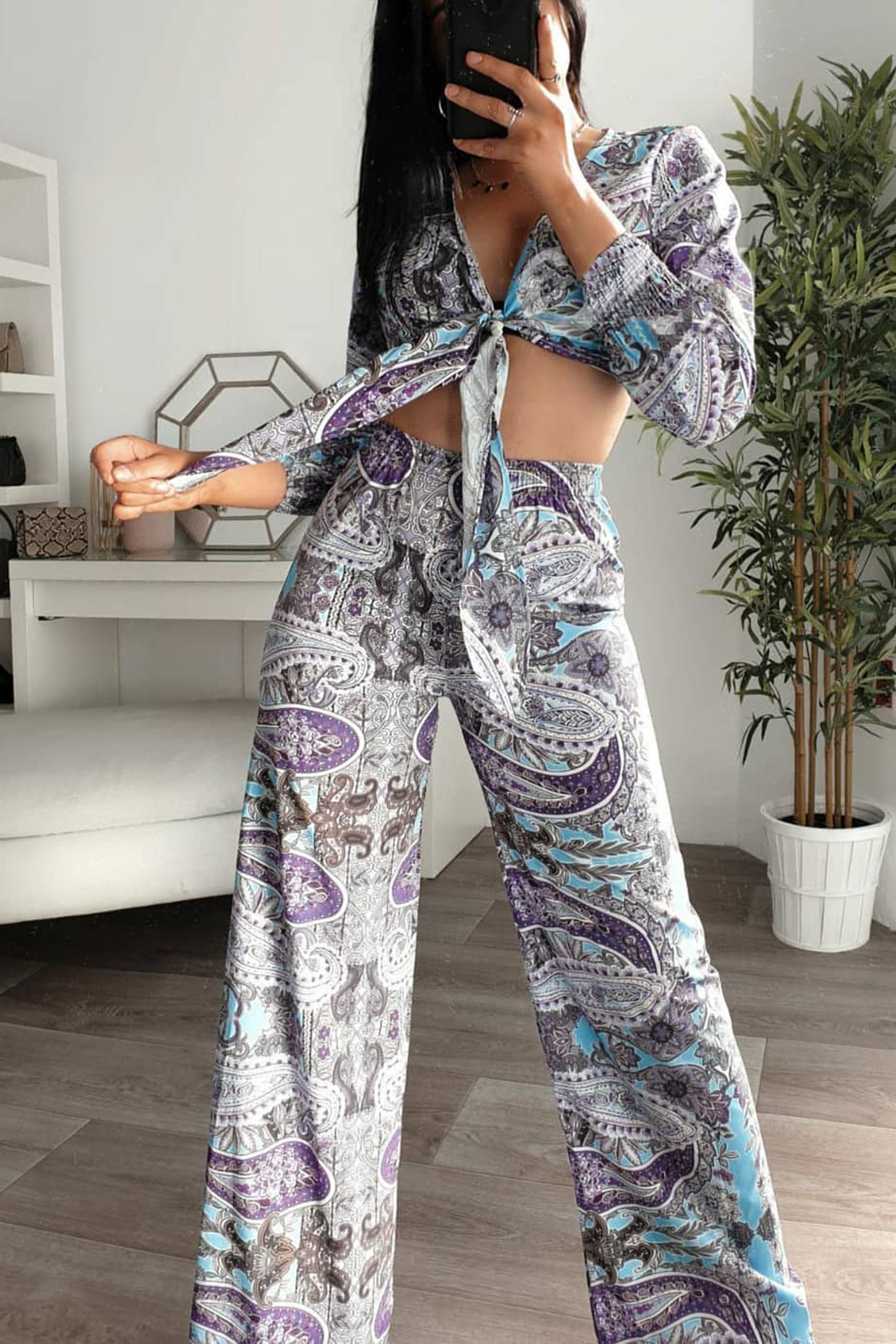 Hippie σετ με λαχούρια σε γκρι μωβ απόχρωση με τοπ που δένει μπροστά.