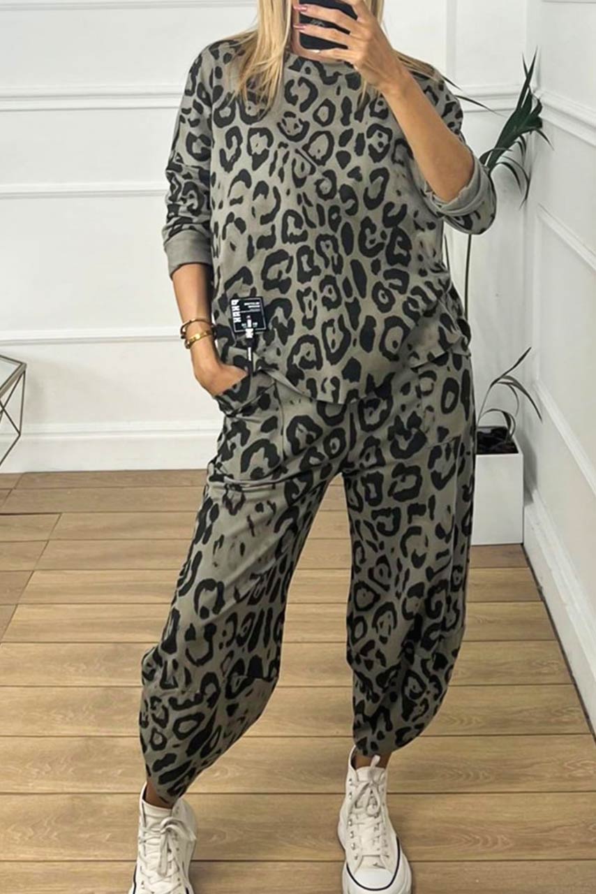 Leopard σετ φόρμας.Διαθέτει oversize τοπ ελαφρώς ασύμετρο και άνετο παντελονάκι με λάστιχο στην μέση με τσέπες.