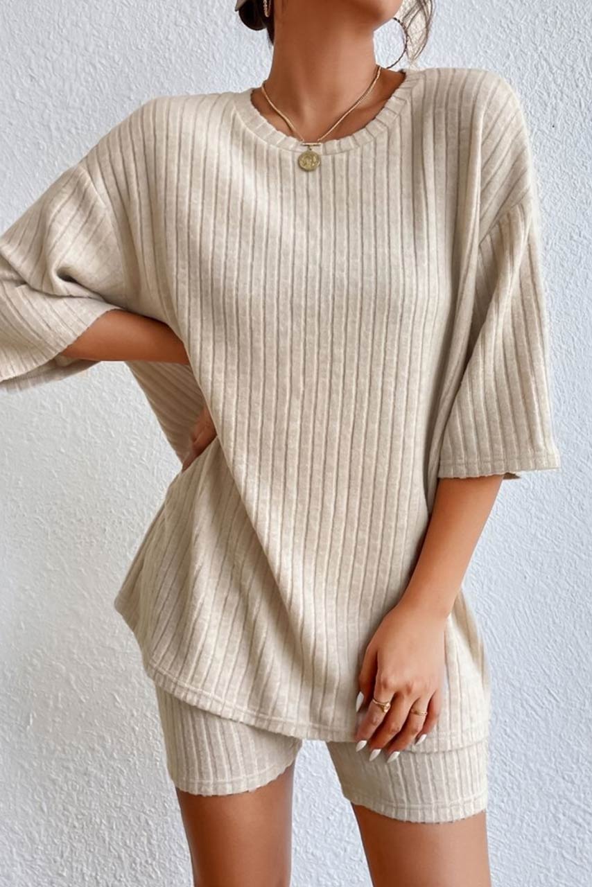 Lounge casual σετάκι με ριχτό άνετο μπλουζάκι και biker σορτσάκι σε rib υφανση. Για στυλάτες και άνετες φθινοπωρινές εμφανίσεις.
