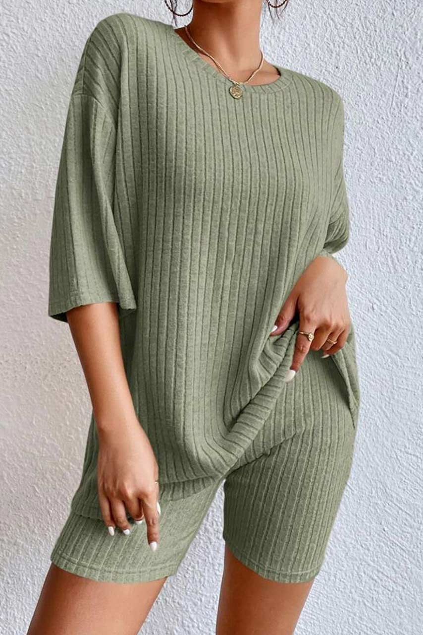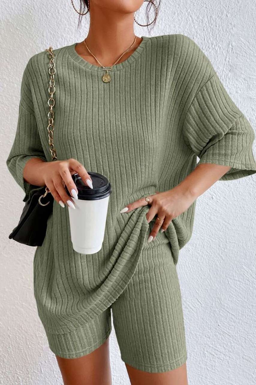 Lounge casual σετάκι με ριχτό άνετο μπλουζάκι και biker σορτσάκι σε rib υφανση. Για στυλάτες και άνετες φθινοπωρινές εμφανίσεις.