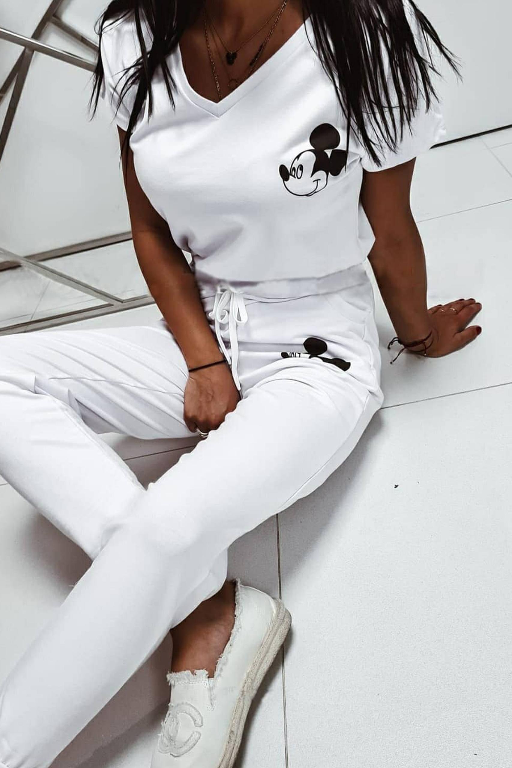 Total white φόρμα V neck με mickey print και λάστιχο στο τελείωμα.