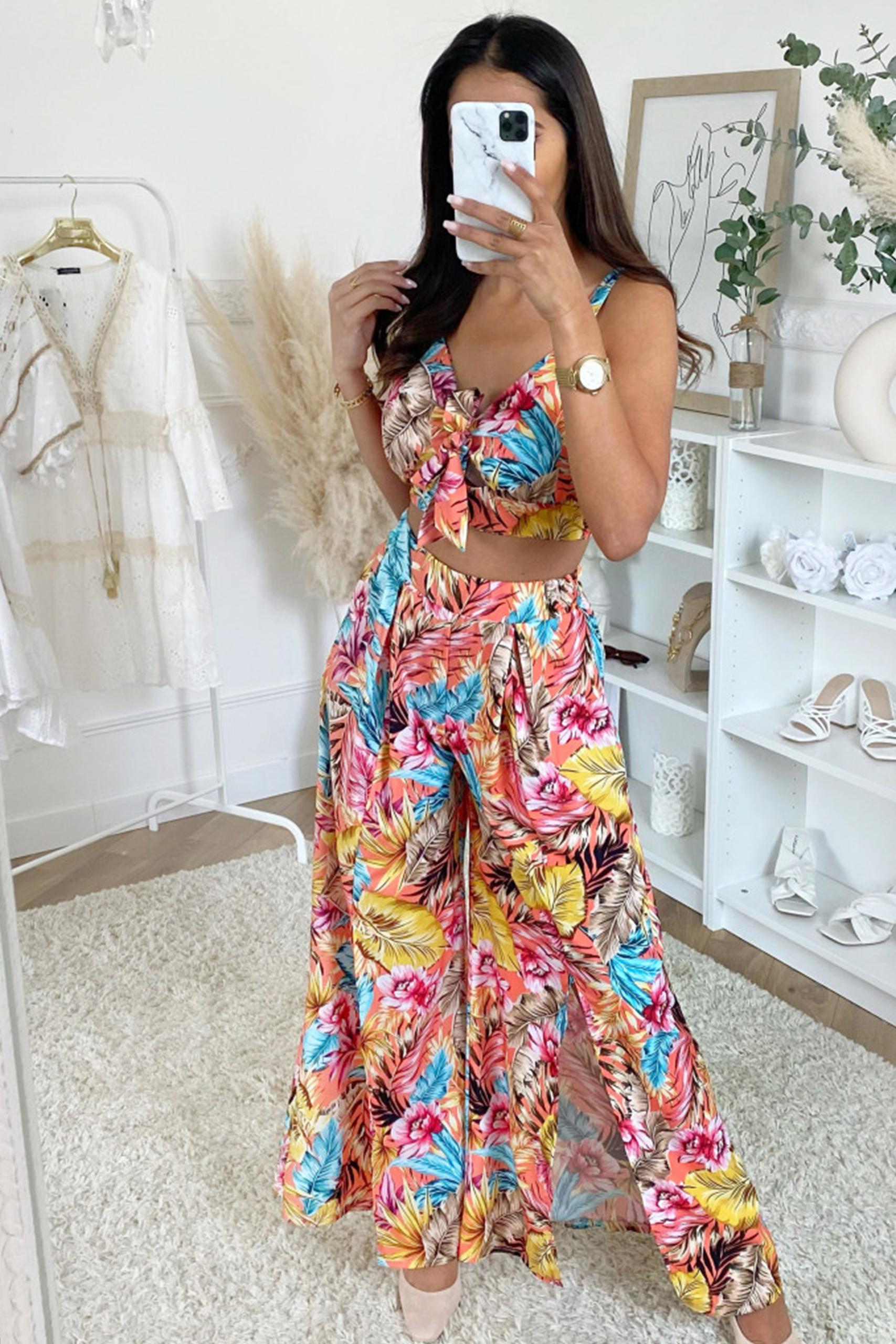 Πολύχρωμο σετ με floral pattern σε έντονες αποχρώσεις με crop top και σκισίματα στο παντελόνι.