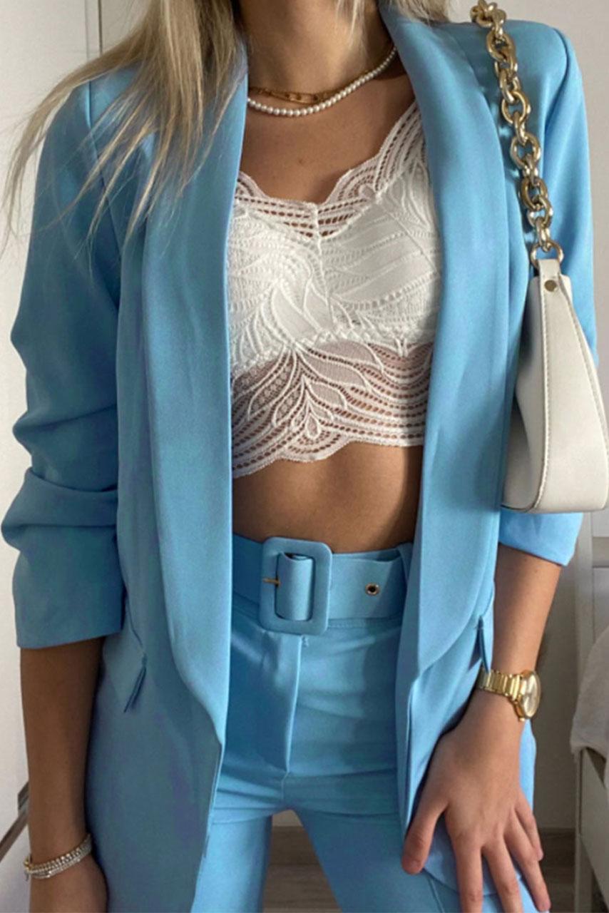 90s inspired office σετ σακάκι και παντελόνι καμπάνα σε έντονο τιρκουάζ χρώμα για τις πιο ανοιξιάτικες εμφανίσεις.