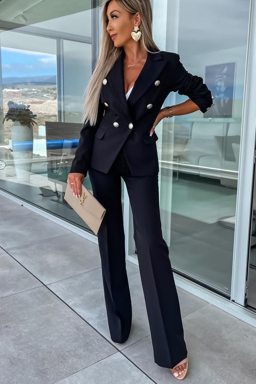 Σετ κοστούμι με κουμπάκια και διακοσμητικές τσέπες για το απόλυτο office look.Το παντελόνι είναι καμπάνα σε άνετη γραμμή.