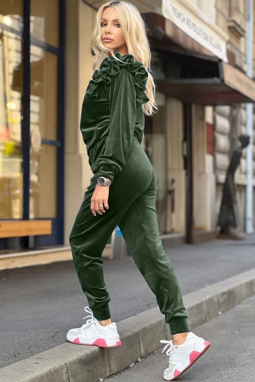 Casual glam velvet σετ φόρμας σε χακί απόχρωση με βολάν on top και παντελόνι jogger.