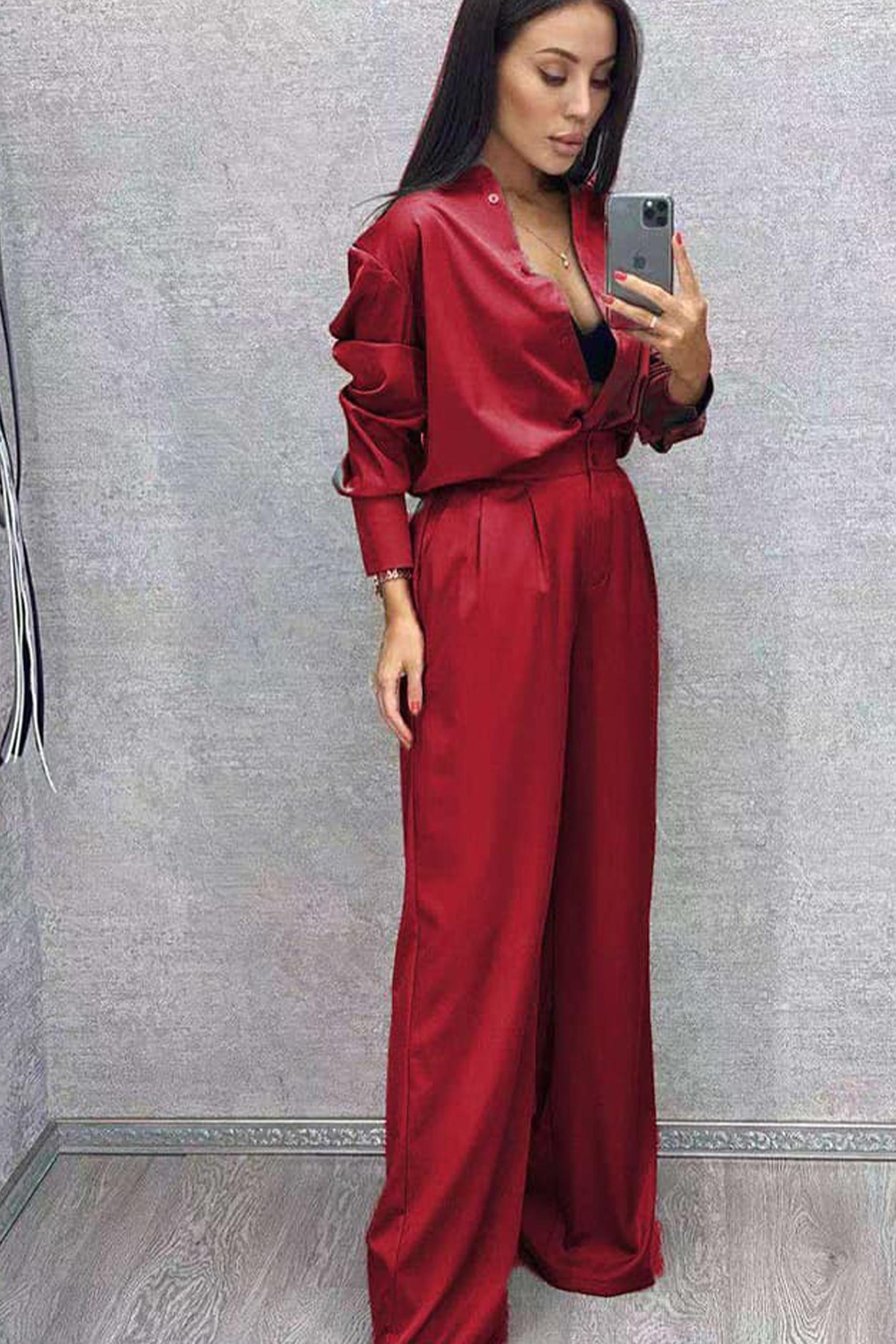 Satin longline σετ σε έντονο wine red ή μαύρο, με πουκάμισο on top και ψηλόμεση μακρυά παντελόνα.