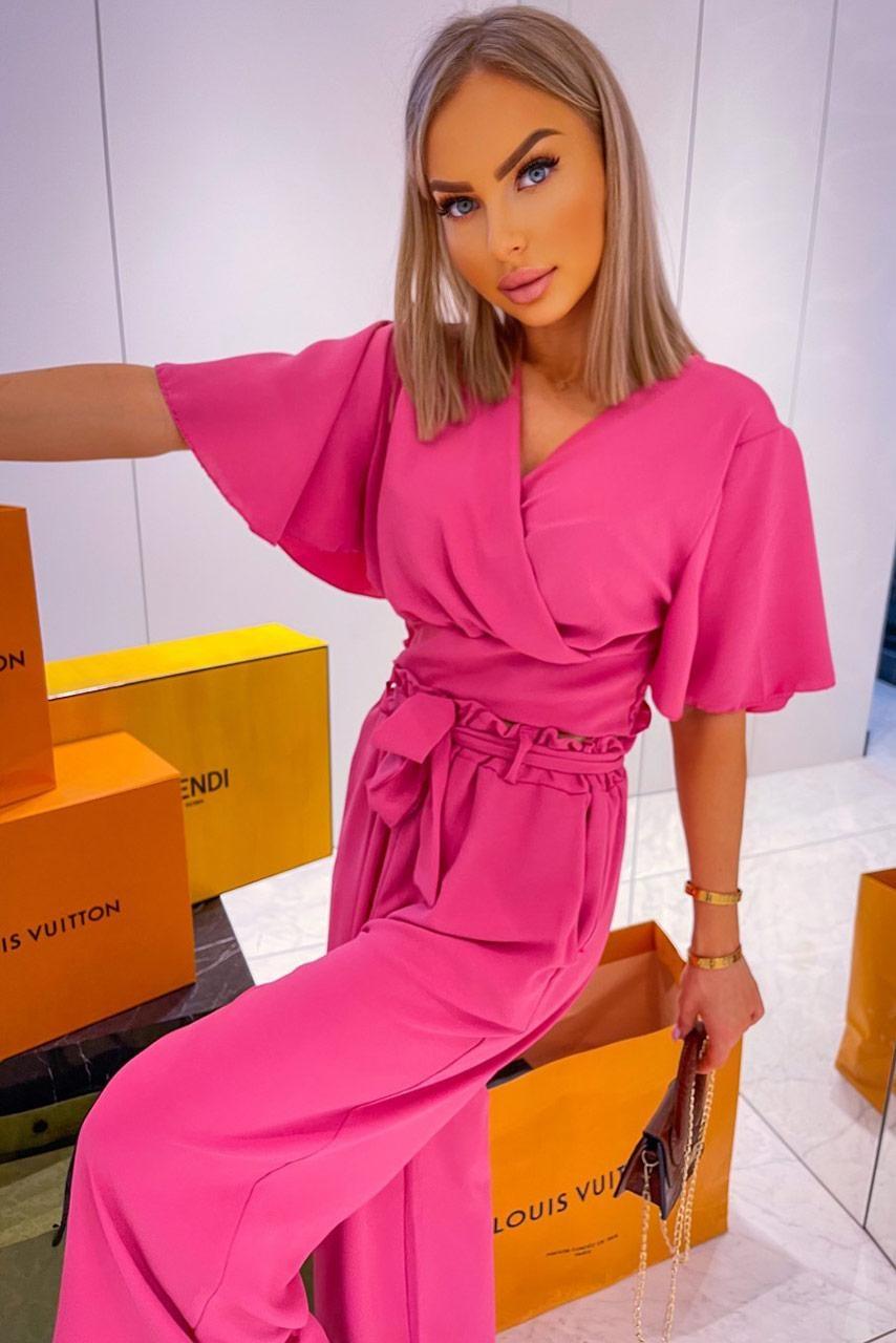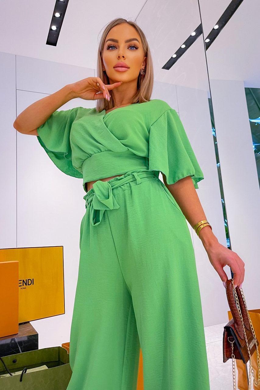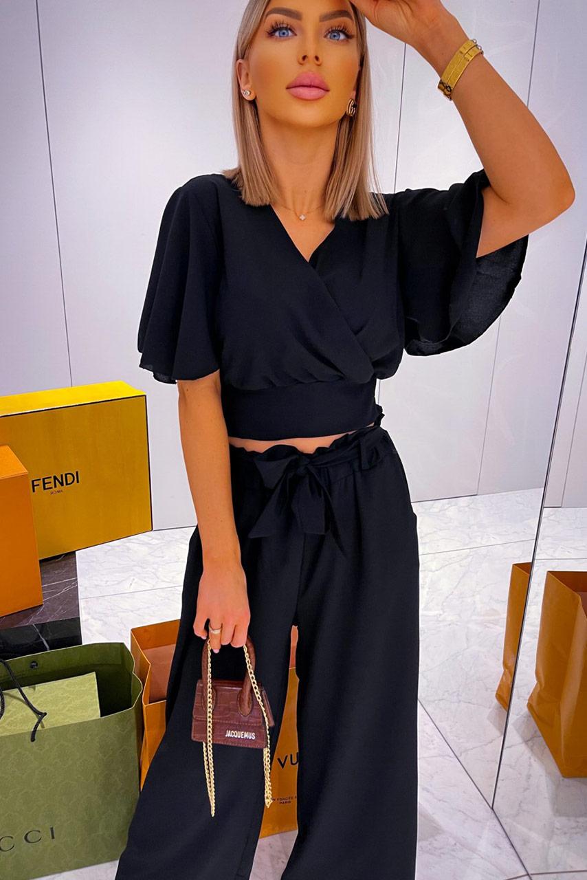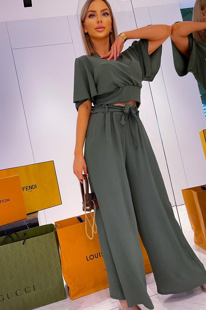 Casual office σετ σε πολλές αποχρώσεις με κοντομάνικο loose crop top με λαιμόκοψη V και longline παντελόνα σε Α γραμμή.
