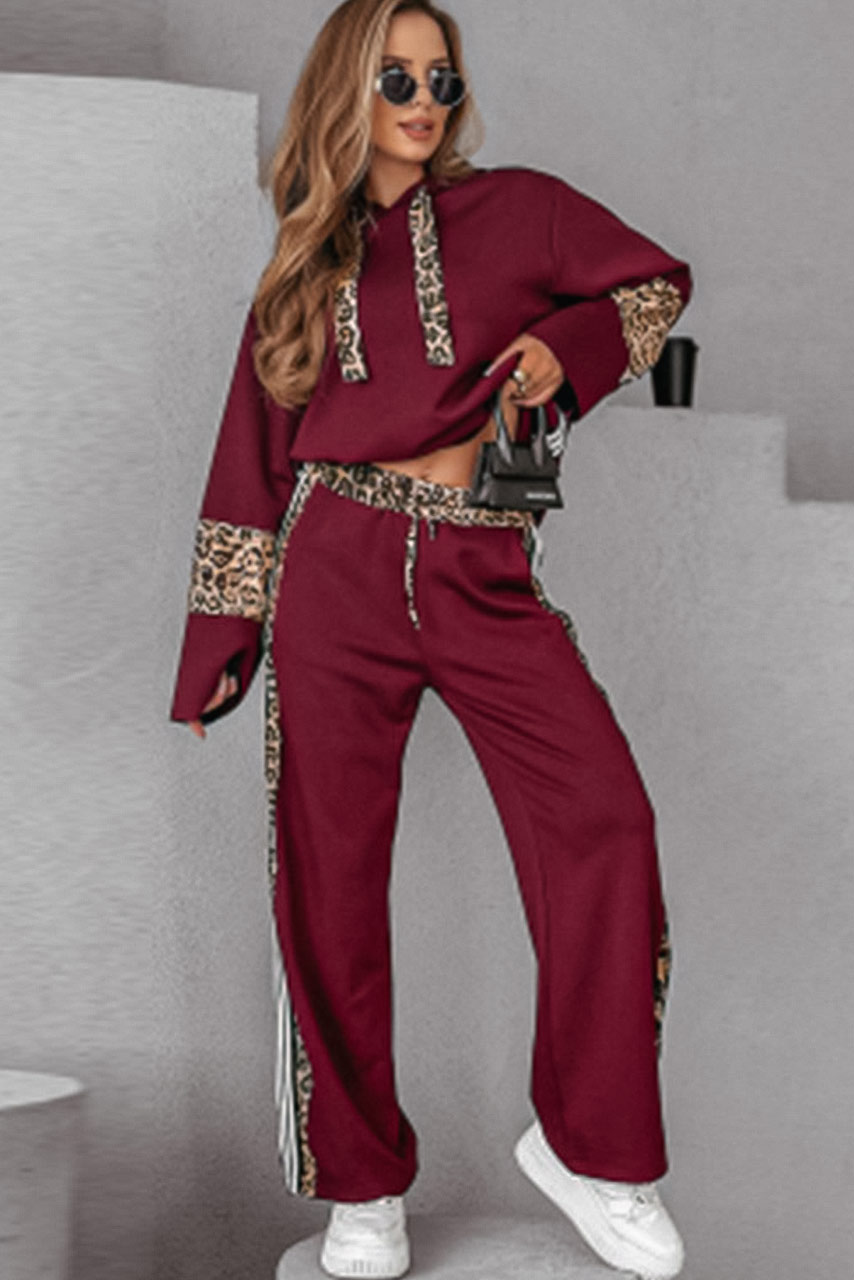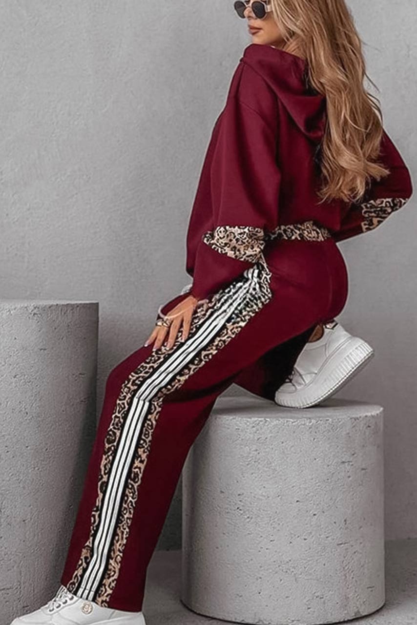 Αναδείξτε το sporty chic στυλ σας με αυτό το εντυπωσιακό σετ φόρμας, που συνδυάζει άνεση και μοντέρνο design! Η μπορντό μπλούζα με oversized εφαρμογή και οι λεπτομέρειες από λεοπάρ print στα μανίκια και την κουκούλα χαρίζουν μια δυναμική πινελιά στην εμφάνισή σας. Το παντελόνι με φαρδιά γραμμή διαθέτει πλαϊνές ρίγες με animal print και διακριτικές λευκές ρίγες, προσθέτοντας αθλητικό χαρακτήρα στο look σας.