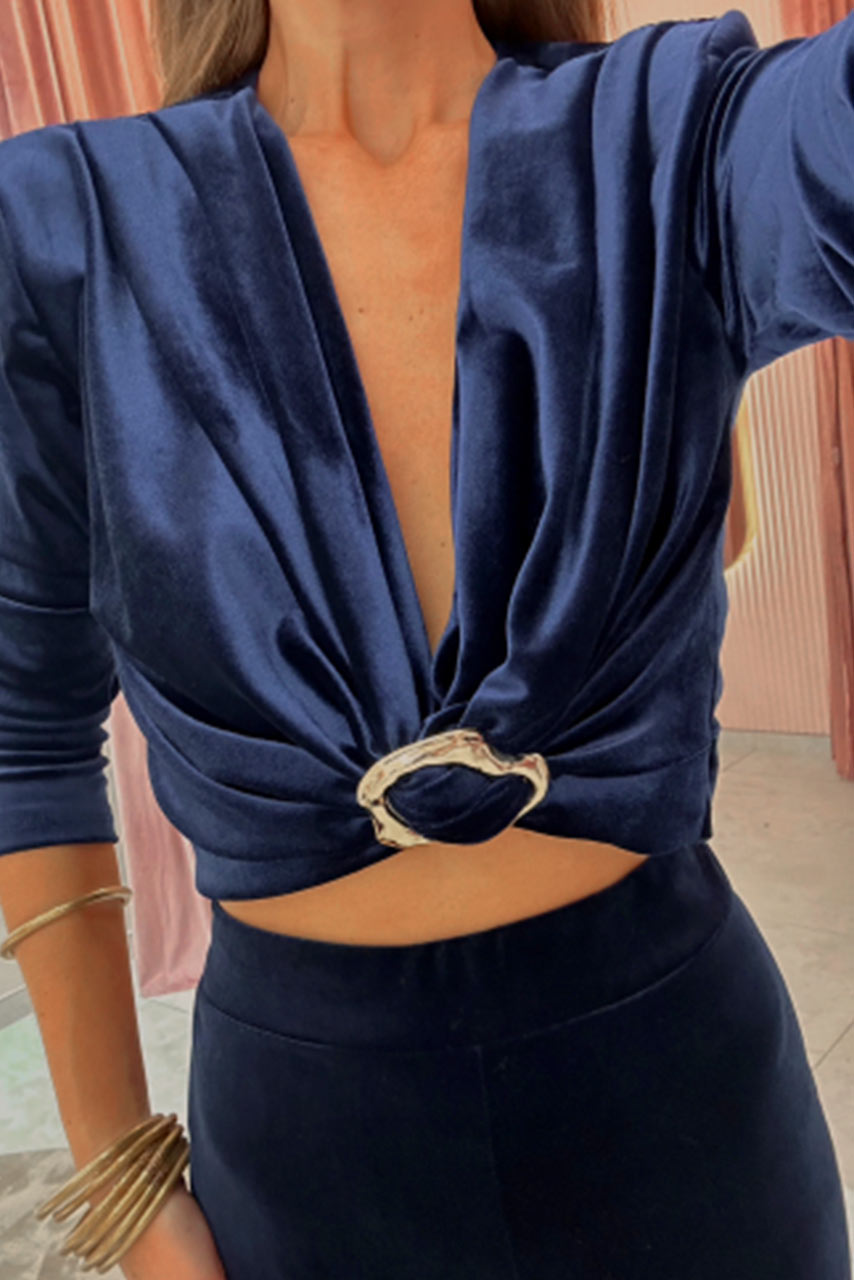 Σετ μπλε crop top βελουτέ με χρυσό κρίκο με ελαστική παντελόνα. Διατίθεται σε One Size που καλύπτει μεγέθη S, M και L.