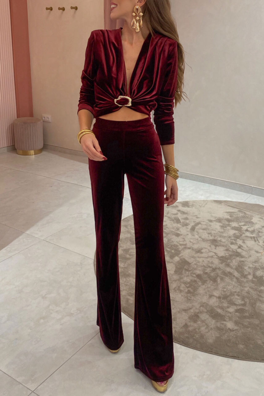 • Σετ βελουτέ 2 τεμαχίων | Μακρυμάνικο crop top με μεταλλικό κρίκο | Παντελόνι με λάστιχο στη μέση