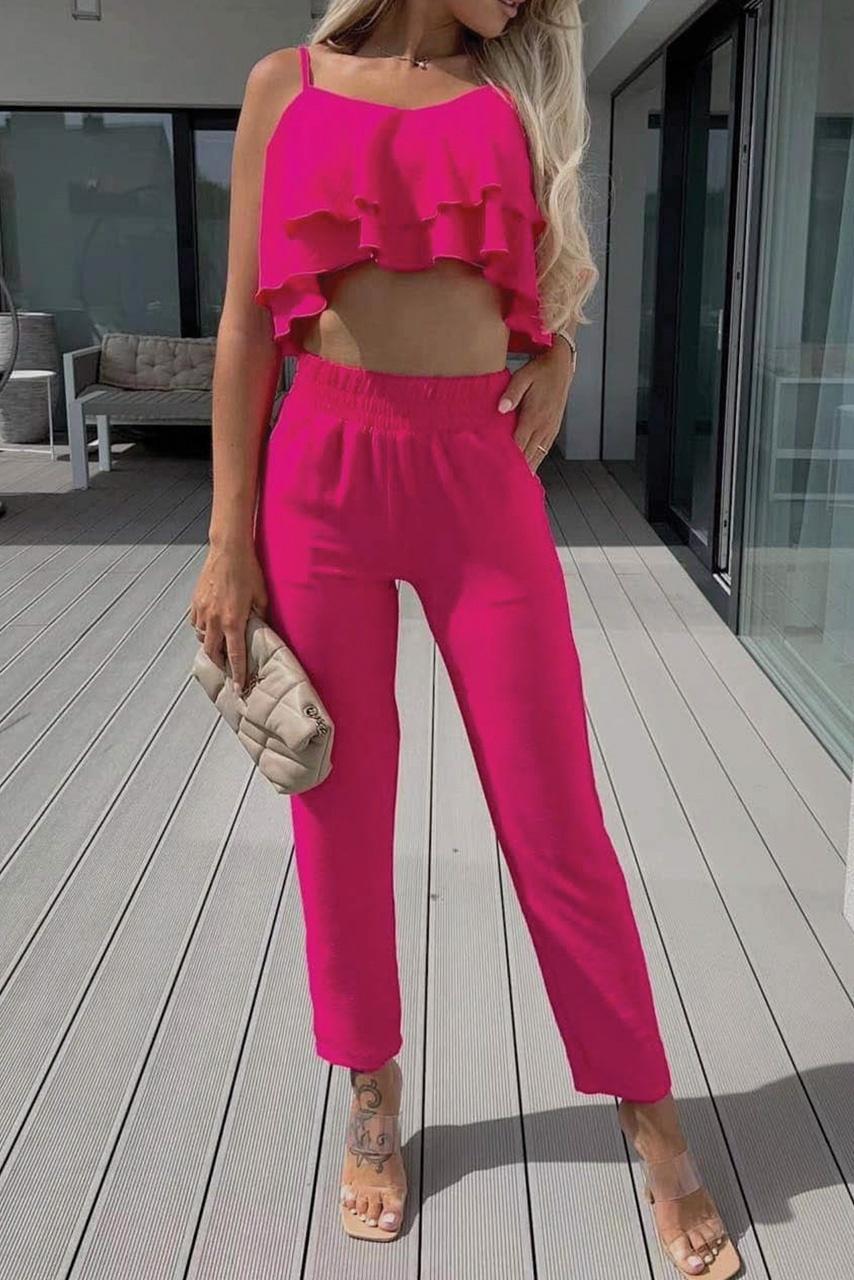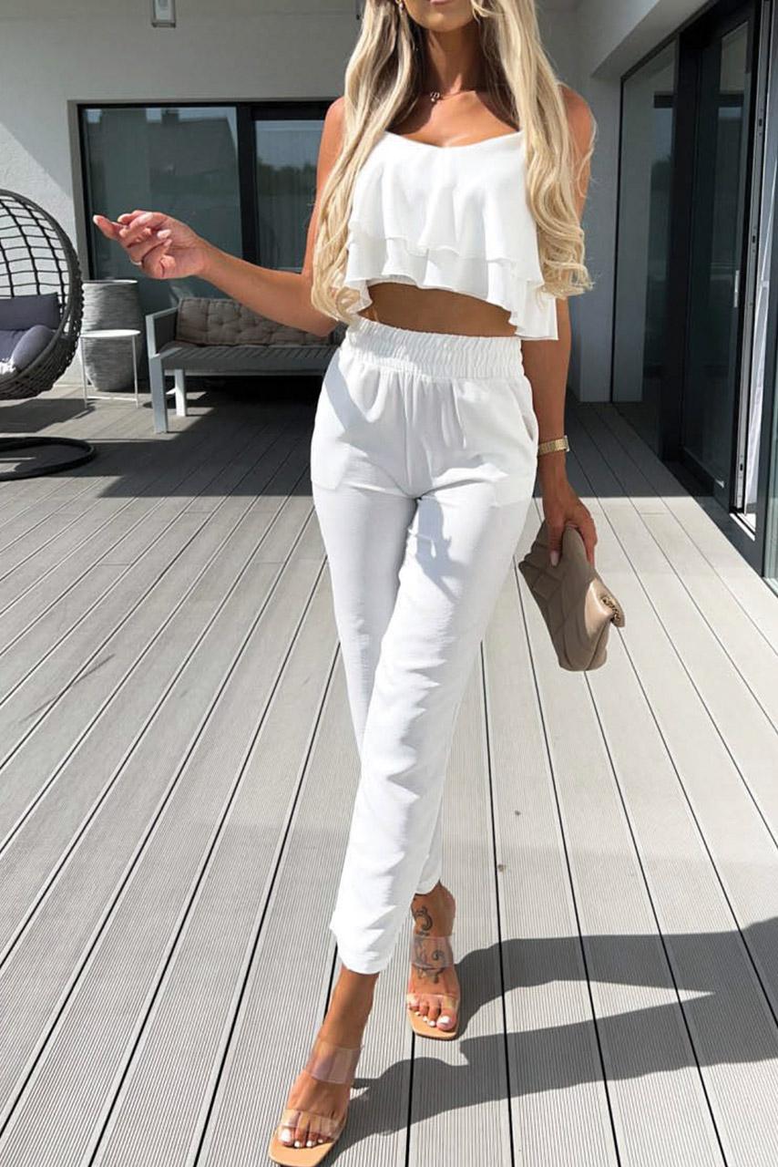 Casual basics σετ με τοπ βολάν σε κλασσικές αποχρώσεις του λευκού και του μαύρου και του καλοκαιρινού φούξια.