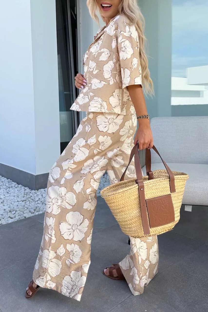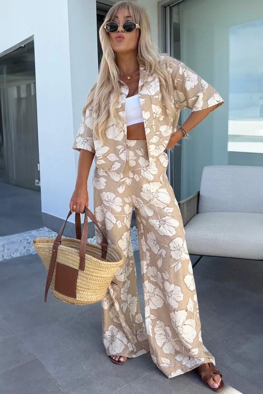 Ένα σετάκι που μυρίζει καλοκαίρι! Το floral σύνολο με μπεζ λουλούδια σε λευκή βάση είναι ό,τι χρειάζεσαι για τις πιο στιλάτες σου εμφανίσεις στην πόλη ή στο νησί. Το φαρδύ παντελόνι προσφέρει αέρινη αίσθηση, ενώ το πουκάμισο με τα κοντά μανίκια και την relaxed εφαρμογή απογειώνει το look.