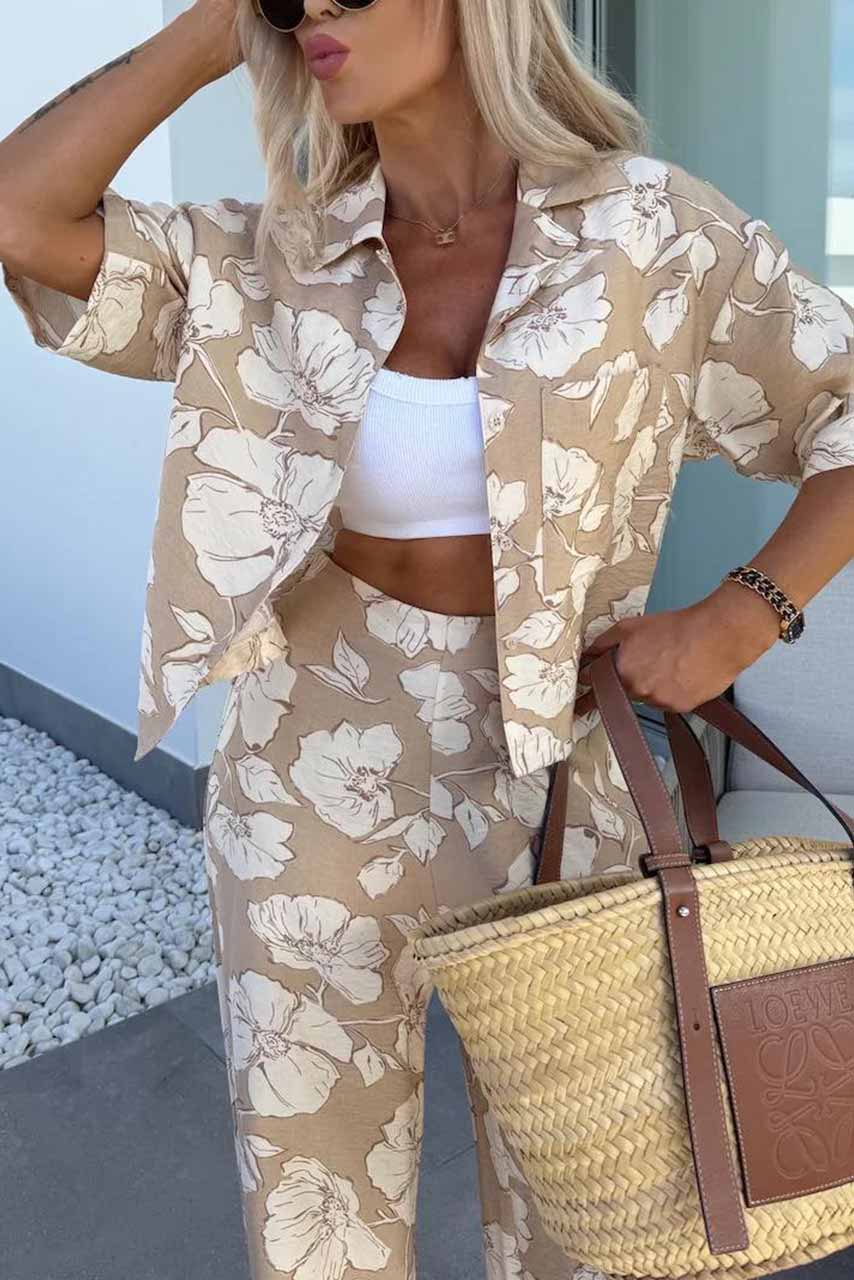 Σετάκι παντελόνι και πουκάμισο με μπεζ λουλούδια Σετάκι παντελόνι και πουκάμισο με μπεζ λουλούδια