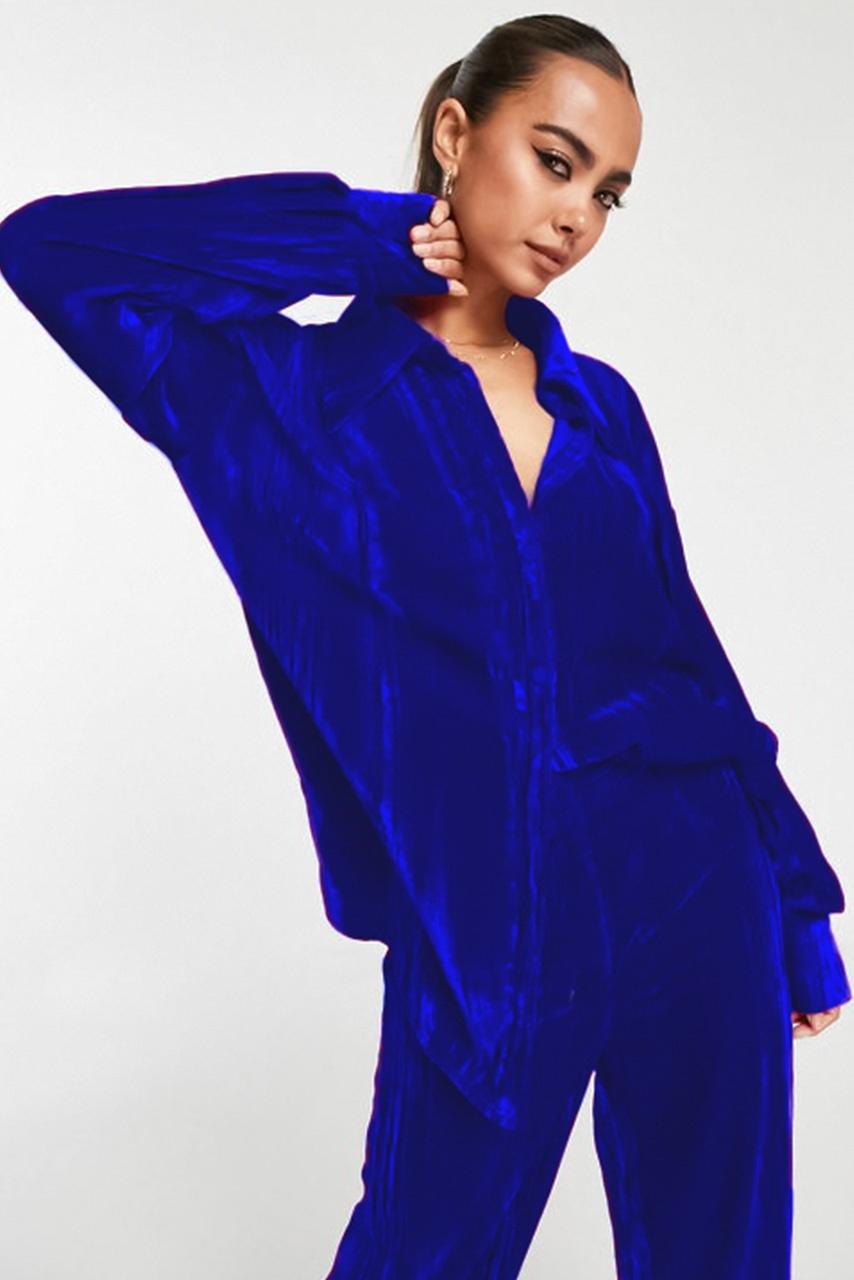 Velvet glam casual all day σετ σε velour υφή με loose πουκαμίσα και oversized παντελόνι σε μπλε απόχρωση.