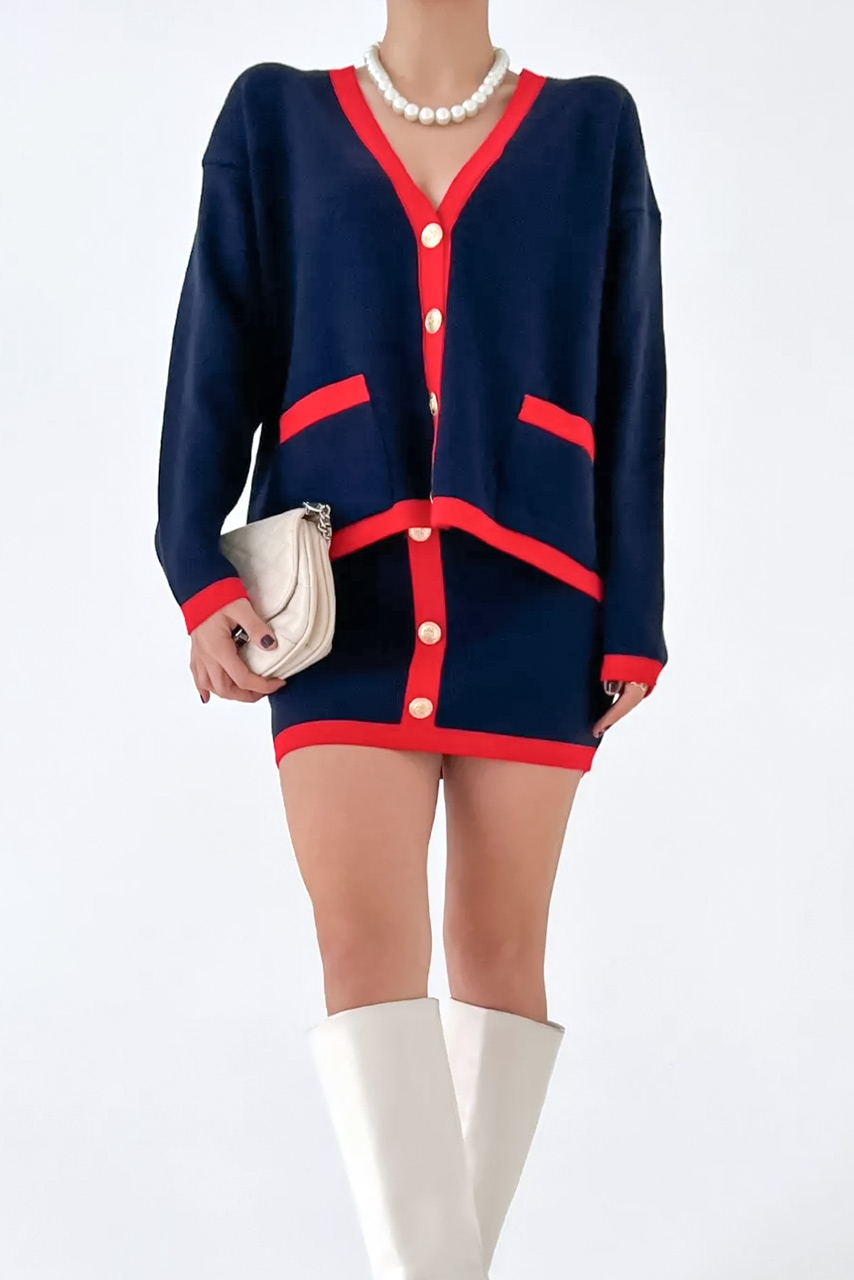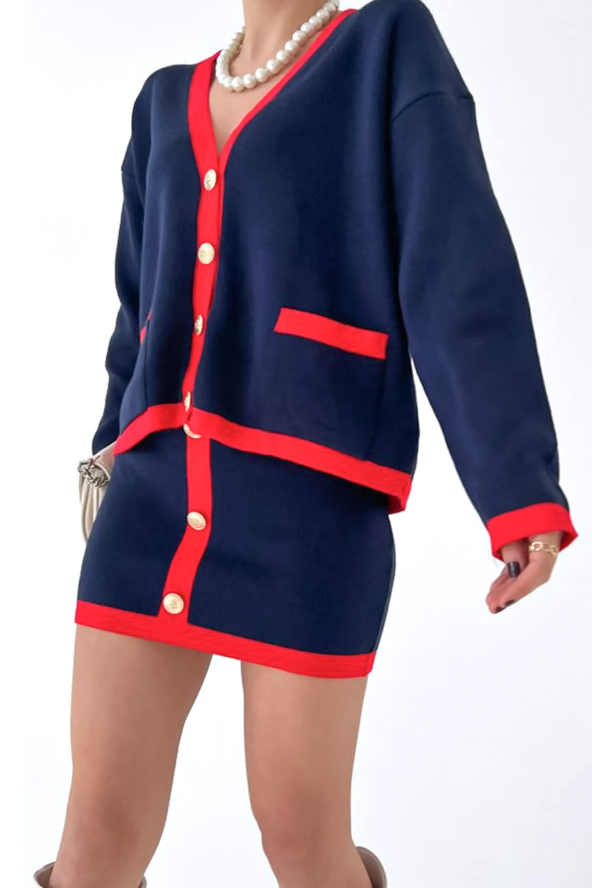 Vintage σετάκι ζακέτα με φούστα με διχρωμία, μπλε και κόκκινο. Το ζακετάκι είναι σε 2oversize γραμμή και η φούστα μίνι.