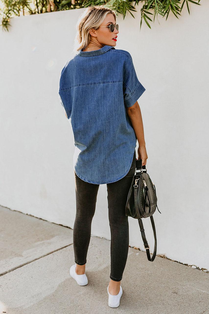 Rock casual all day κοντομάνικο τζιν πουκάμισο με κουμπιά κατά μήκος σε κλασσική blue jean απόχρωση.