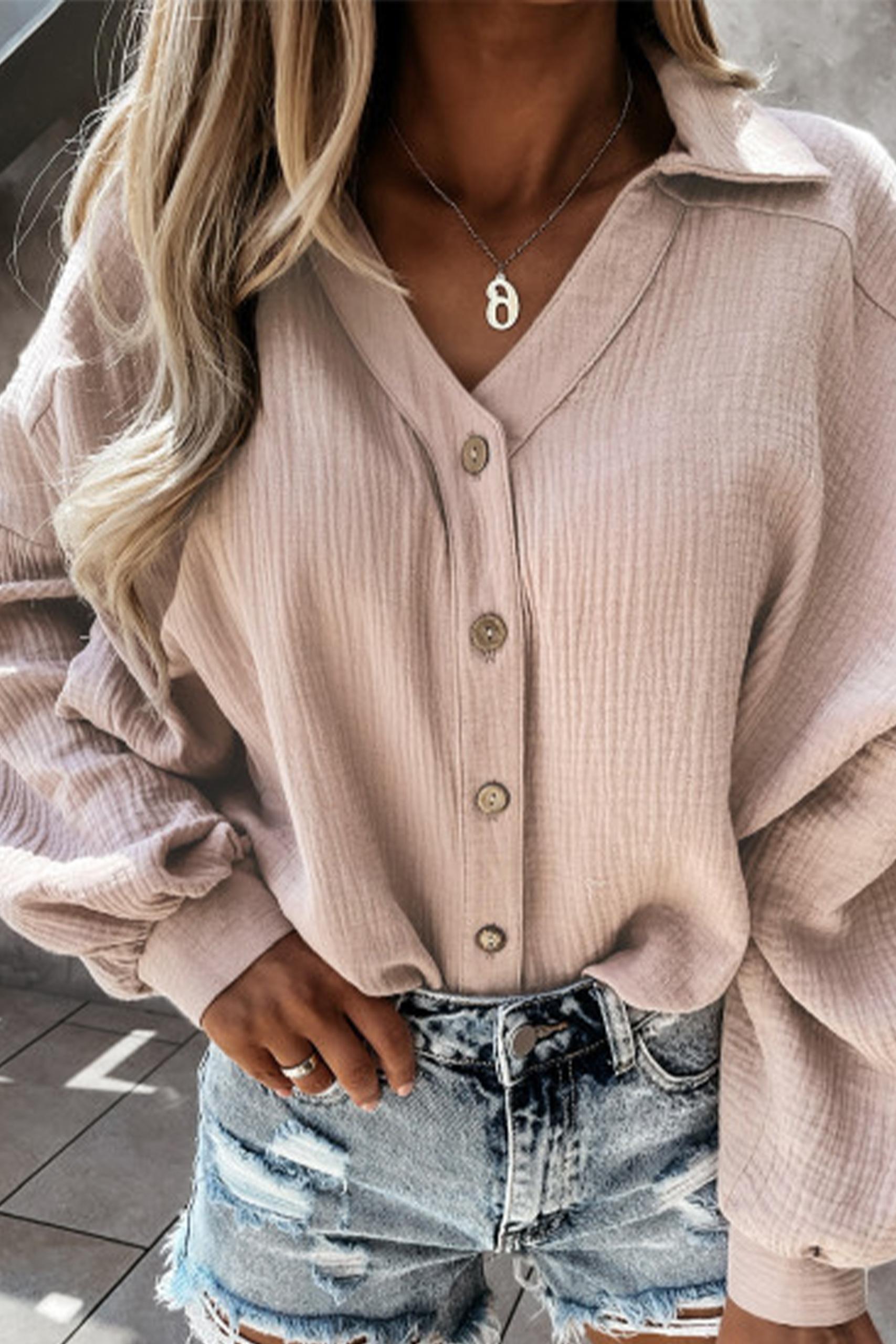 Λινό πουκάμισο V neck με balloon μανίκια και μικρά κουμπιά κατά μήκος.